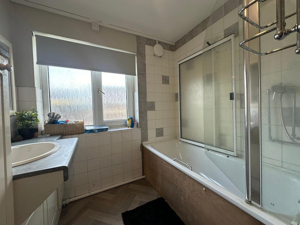 Bath tub with shower over. Wash hand basin. WC. Radiator and window to rear.