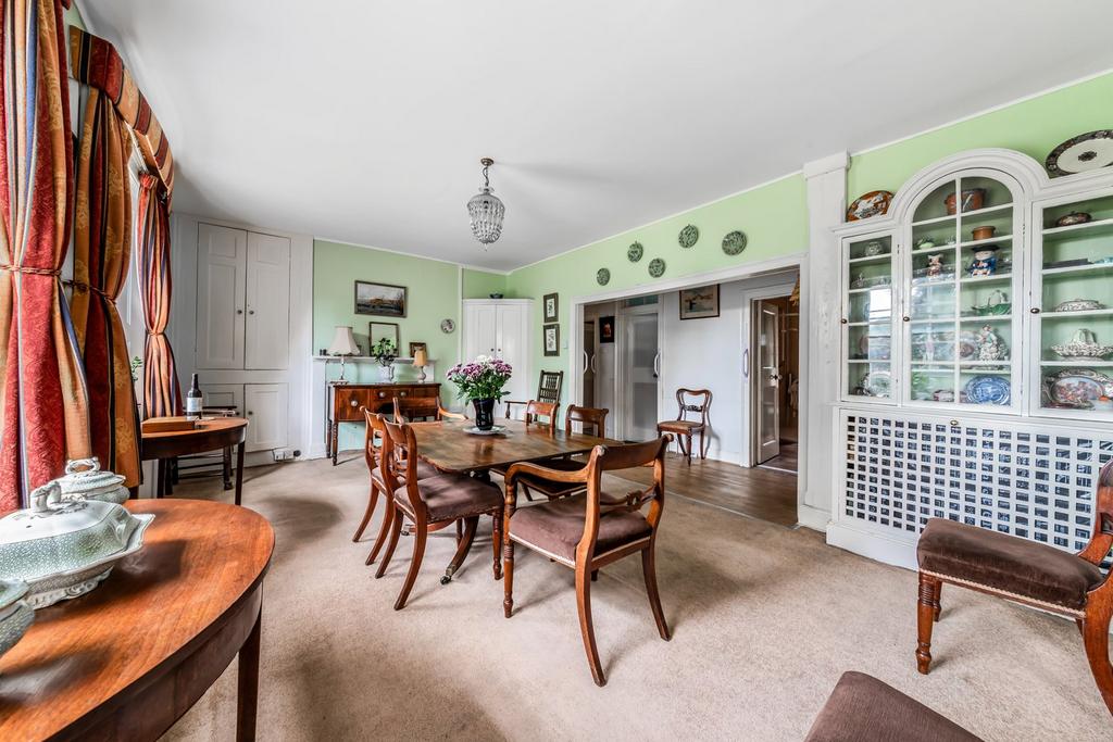 5.47m x 3.66m (17' 11" x 12' 0") Elegant room with two sash windows to rear overlooking the beautiful gardens, two radiators ,built in cupboards and dresser, covered fireplace, door to kitchen, open to hall.