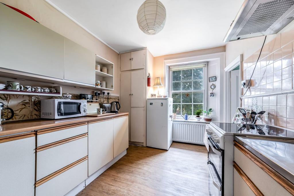 2.58m x 3.66m (8' 6" x 12' 0") Fitted with wall and base units, worktops, shelving, double drainer stainless steel sink unit, larder cupboard, radiator, sash window to rear, space for cooker and fridge, sash window to rear.