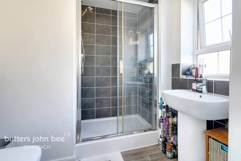 A suite comprising WC, pedestal hand wash basin, double shower, partially tiled walls, heated towel rail and uPVC double glazed window to the side.