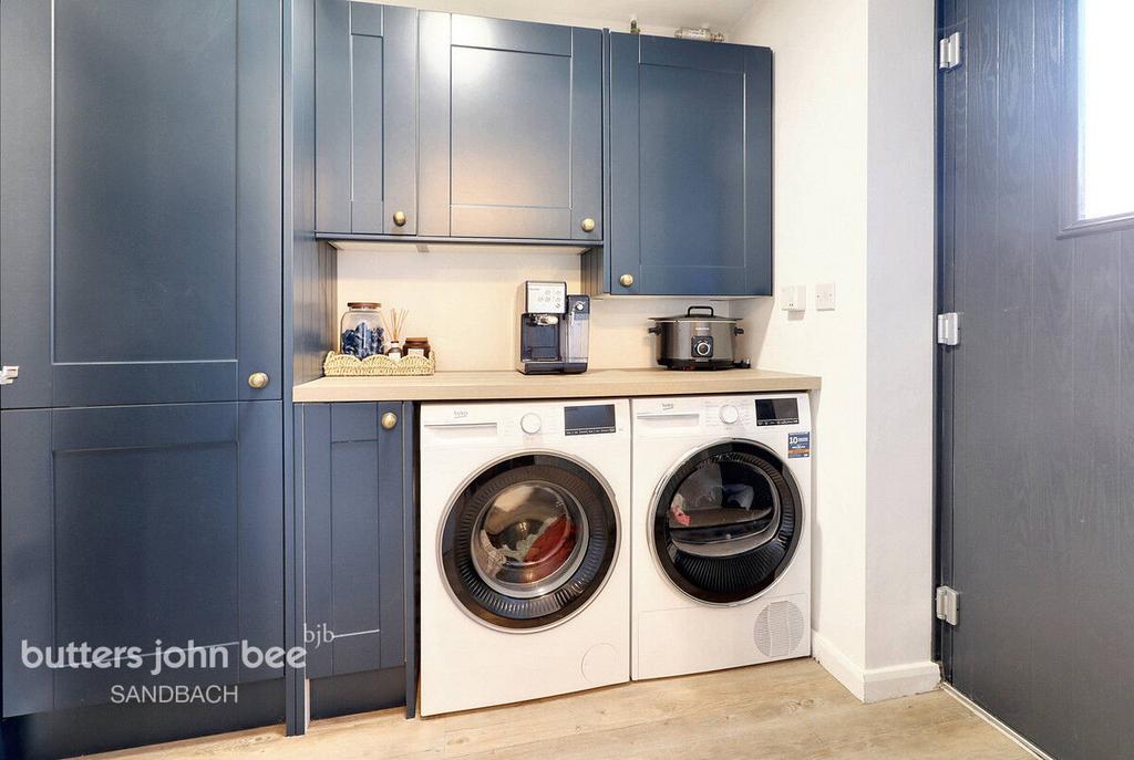 A range of wall mounted and base units under complimentary work surfaces, space and plumbing for washing machine and tumble dryer, radiator, composite door to the garden.