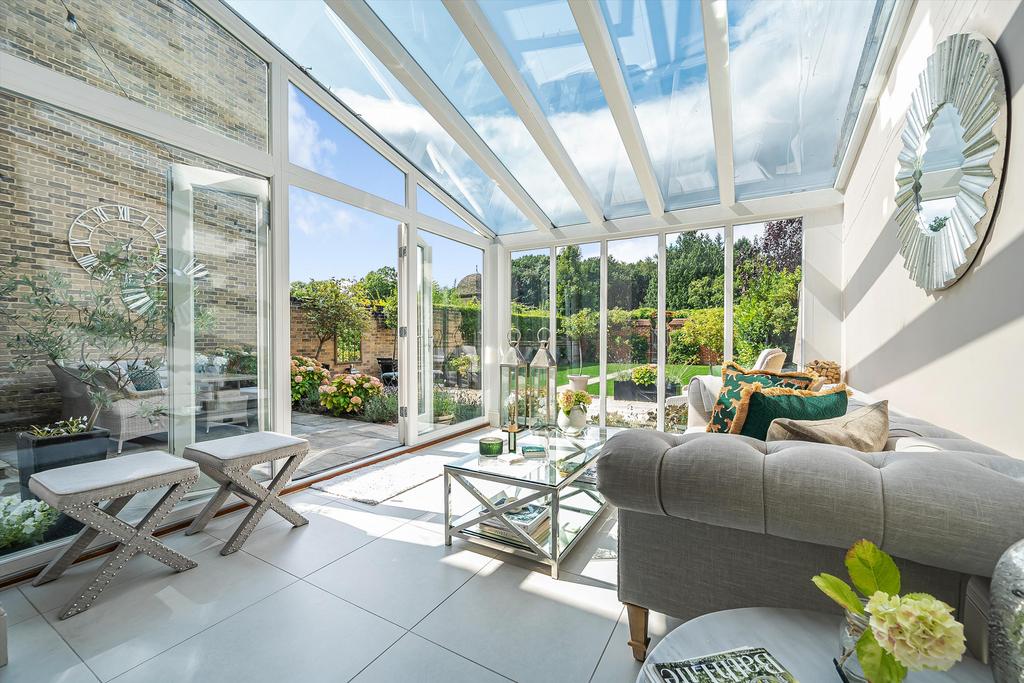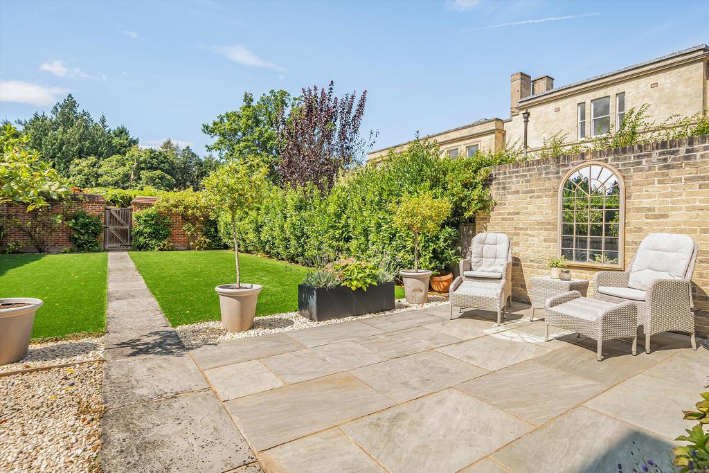 The rear west-facing garden is laid mainly to lawn, bordered with flower beds and gated access to communal gardens. Outside the conservatory and sitting room, an attractive paved terrace area is ideal for alfresco entertaining. The property has a single garage with additional allocated parking for one car.