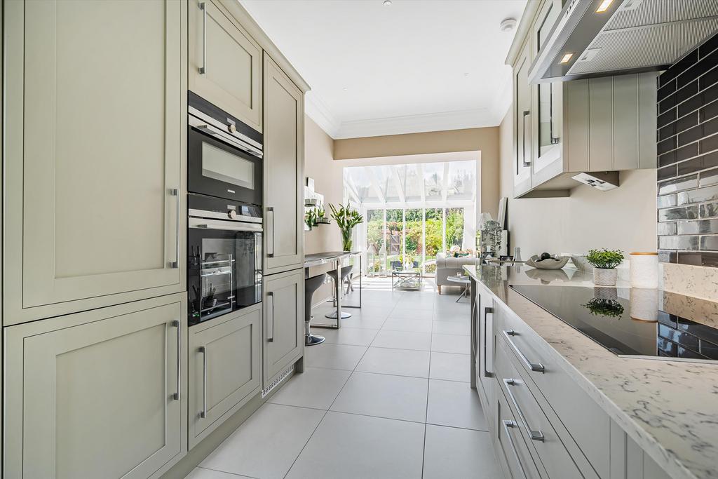 The property is entered via a welcoming reception hall with wood flooring. From here the hall opens into both the kitchen and reception rooms, all with underfloor heating. The double aspect sitting/dining room is to the left of the entrance hall, with high ceilings and French windows allowing natural light to stream in throughout the room. To the right of the entrance hall is the superb kitchen with a range of wall and base level units and integrated appliances, including a twin oven, dishwasher, fridge-freezer, and washing machine. The kitchen opens into the fabulous garden room with views and access to the beautiful walled garden.