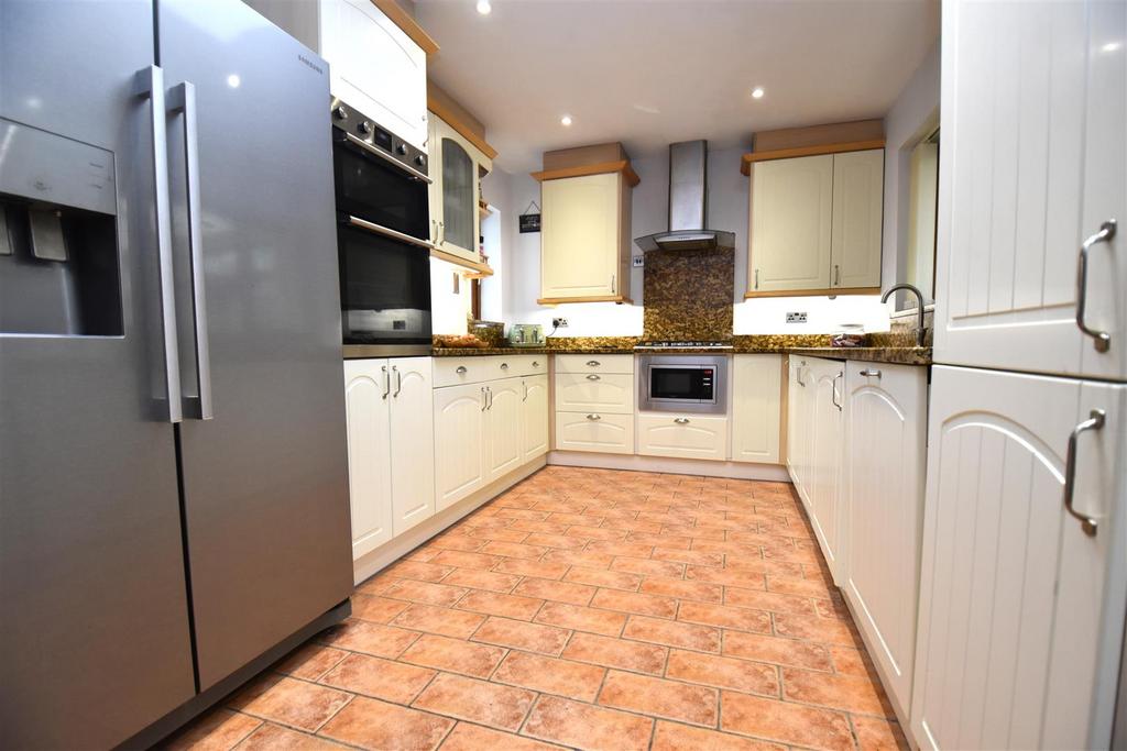 Kitchen - 5.13m x 2.82m (16'10 x 9'3) - Range of eye and base level units with marble effect work surfaces over, inset stainless steel sink drainer unit, integrated 5 ring gas hob with extractor hood over, integrated microwave, integrated oven and grill, integrated dishwasher, integrated washing machine, space for fridge freezer, breakfast bar, UPVC double glazed windows to front and rear aspect, UPVC double glazed French Doors to Conservatory, double glazed skylight, radiator, power points, tiled flooring, smooth plastered ceiling.