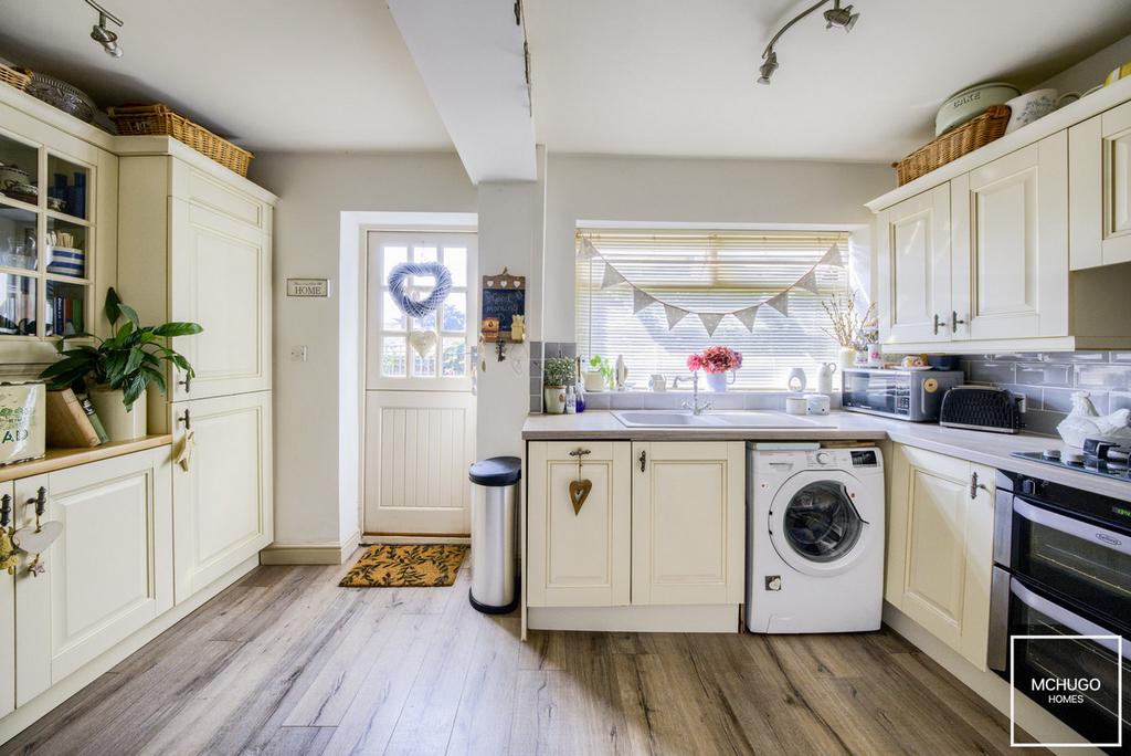 Integrated appliances of ‘Belling’ dishwasher and double oven ‘Hotpoint’ four ring gas hob above, with extractor hood above, featuring a range of wall and base mounted units, roll worktop surfaces, sink with draining area and mixer tap above, subway tiling, double glazed window with rear garden aspect, door to front and stable style door to rear garden, plumbing for washing machine, two ceiling light points with four spot trackers and understairs storage housing ‘Worcester’ boiler and fuseboard.