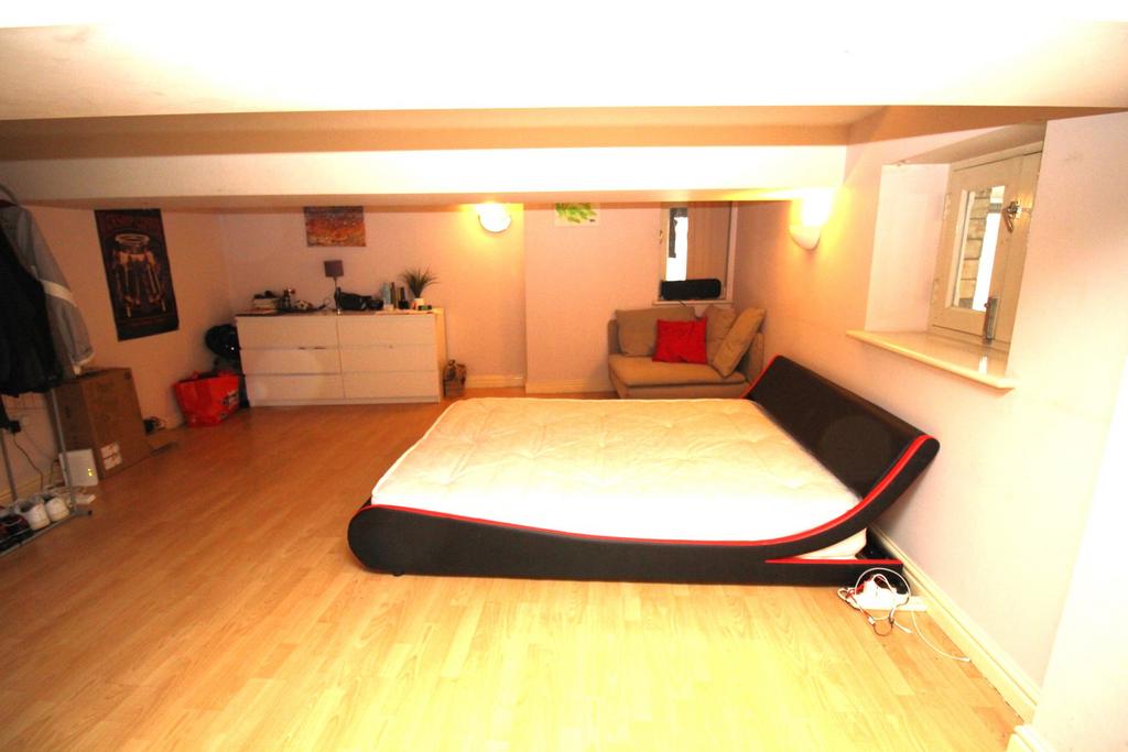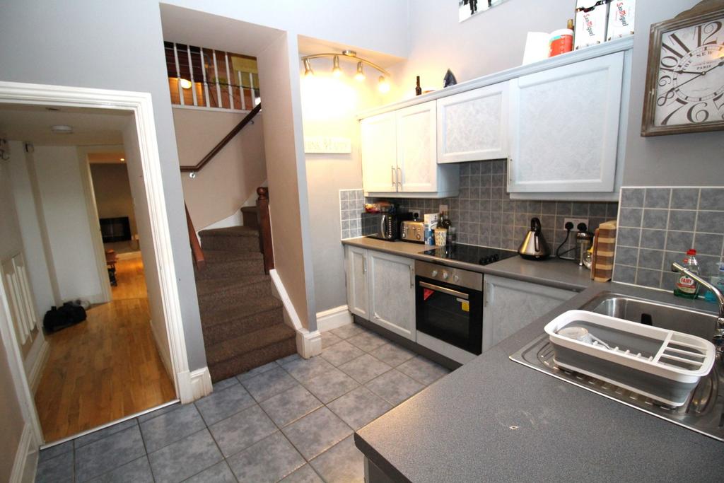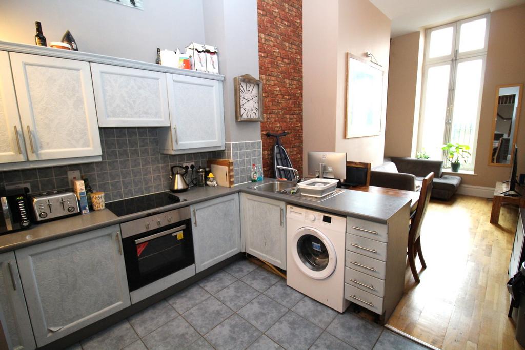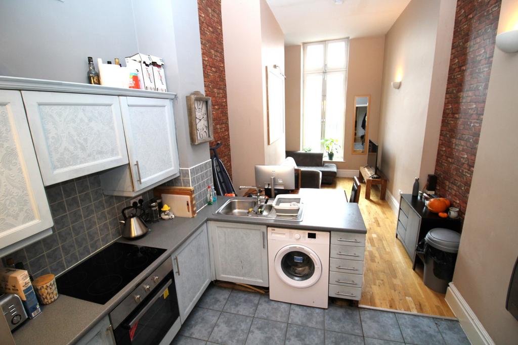Substantial Lounge/Dining Room/Kitchen measuring 23 ft 5 x 10 ft with a maximum ceiling height of 12 ft 1 with tall feature double glazed window, electric heater, beech finish strip flooring and ceramic tiled floor to the kitchen area, divider to Kitchen Area with fitted units with wood doors, slate effect worktops incorporating a range of wall and base cupboards, extractor hood, ceramic hob with electric underoven, space and plumbing for washing machine, one and a half bowl single drainer sink unit, integral fridge, integral freezer. Staircase leading to Upper Level/Bedroom Two Area.