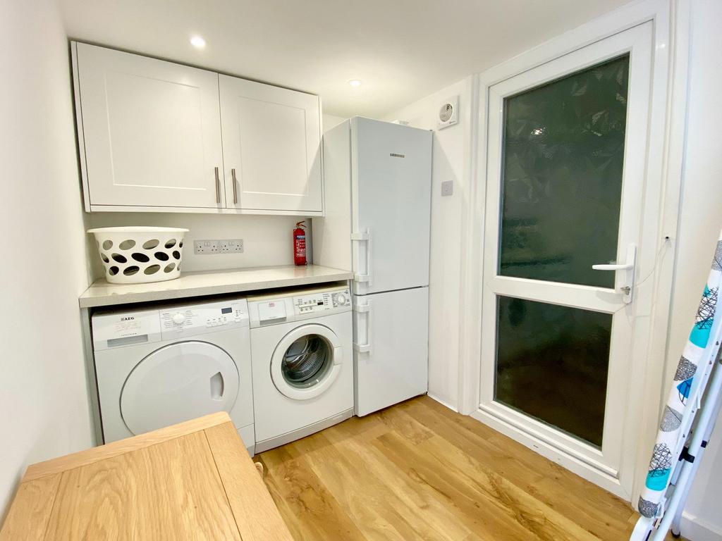 Space and plumbing for washing machine and tumble dryer, space for tall fridge/freezer, range of storage cupboards.