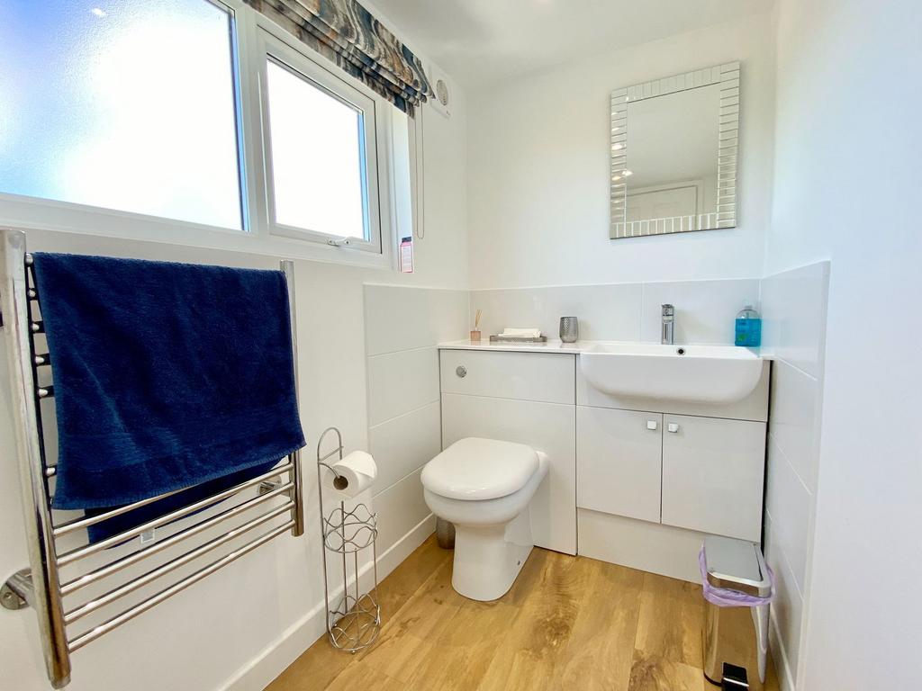Single aspect room with obscure glazed window to side, close coupled low level WC, wash hand basin set into base unit, extractor fan, recessed ceiling lights.