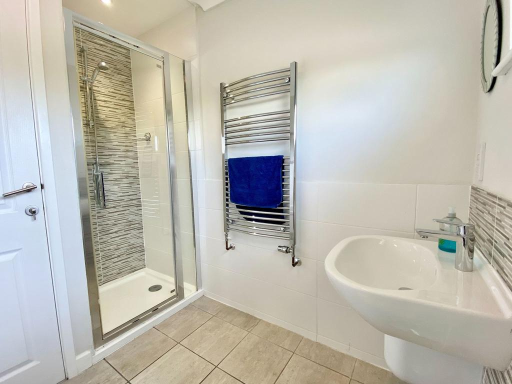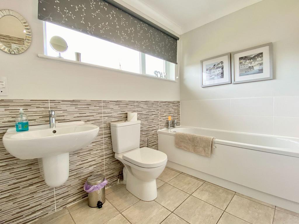 Single aspect room with obscure glazed window overlooking front elevation. Bathroom suite comprising panelled bath, wash hand basin with shaver point over Villeroy and Bosch low level WC, shower cubicle with tiled surround, extractor fan over, recessed ceiling lights.