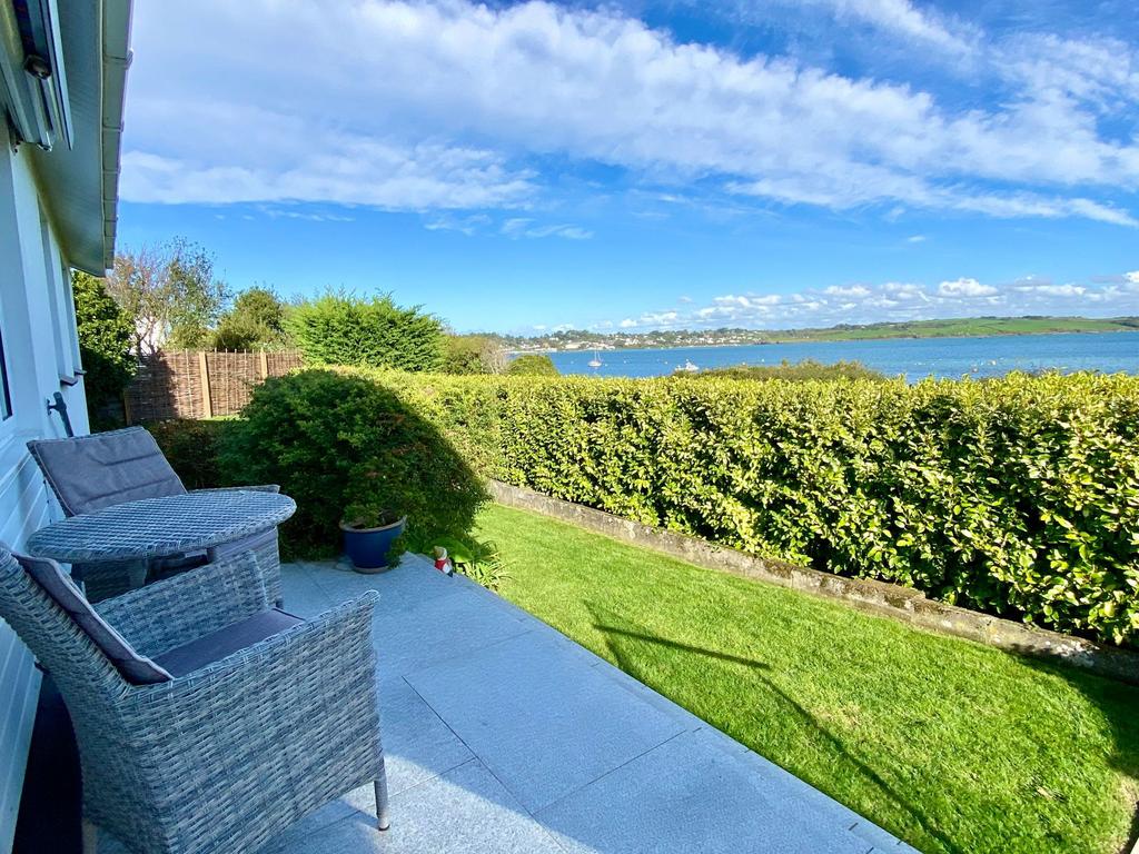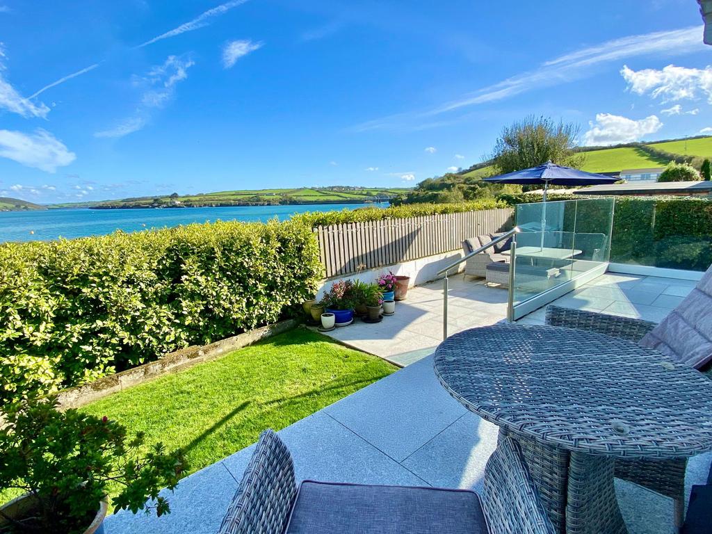 The rear lawned garden is laid to lawn with feature granite paved patio and steps leading to raised paved granite terrace affording delightful views to the estuary.