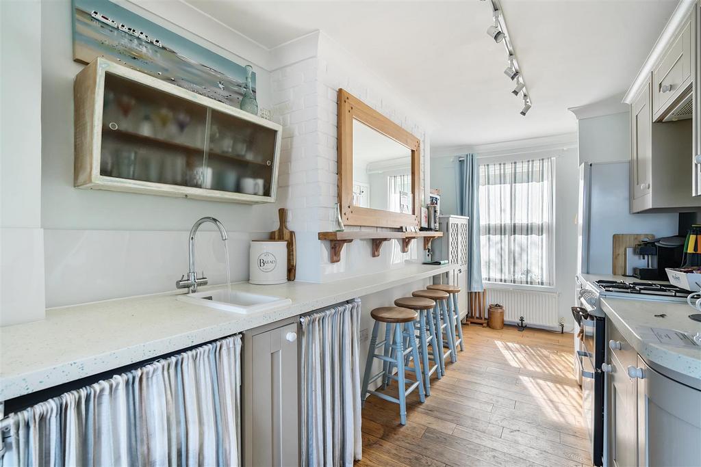 Kitchen Area - Making wonderful use of space, featuring light grey panel-style units to one side, set above and below a granite-effect worksurface and, opposite, matching shallow worksurface providing deep breakfast bar feature, worksurface widening with inset slimline ceramic sink and mixer tap, space and plumbing under for white goods. Space for tall fridge/freezer, electric oven and grill with four-ring gas hob over, glass tiled splashback and concealed extractor over. 'Rustic' timber shelving with painted brickwork behind. Display cupboard and recess providing space for freestanding storage unit, if required. uPVC double glazed sash window to front elevation, radiator. Telephone point, ceiling spotlights, continuation of oak flooring. Open to the:-
