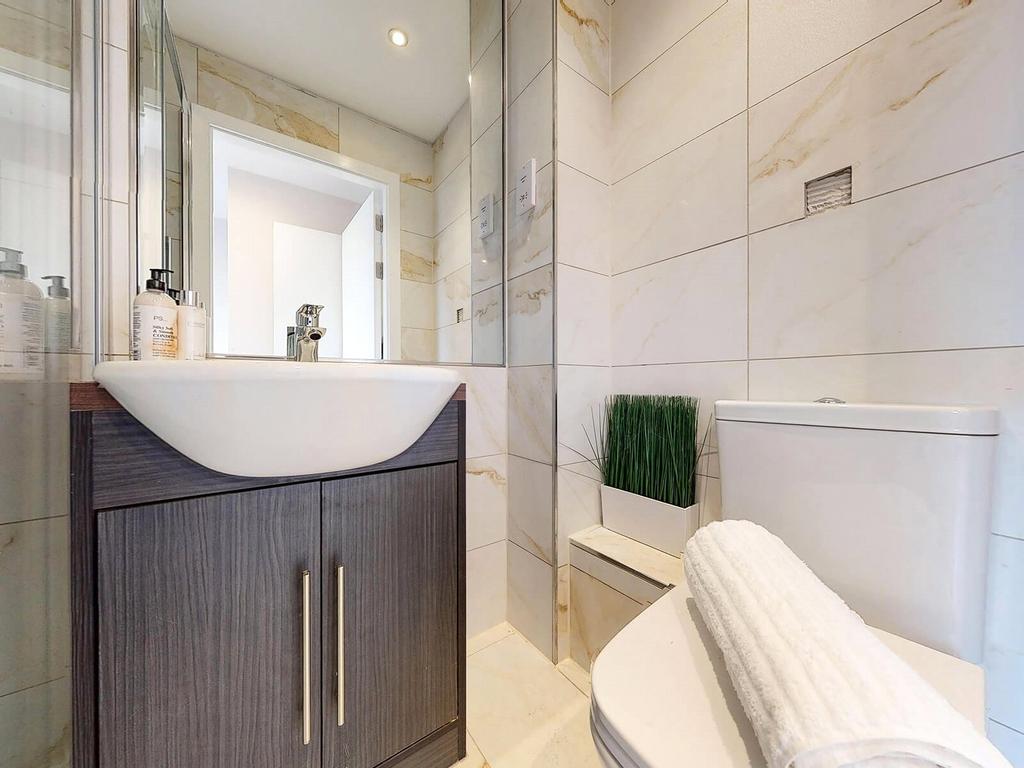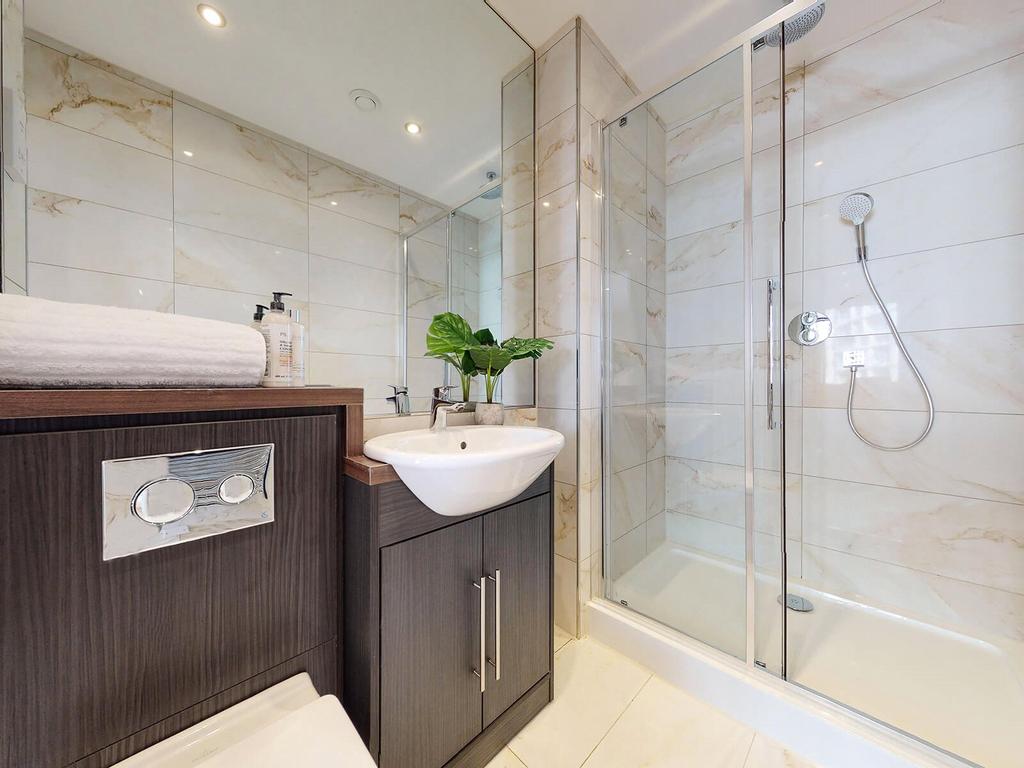 The modern bathroom has premium finishes, integrated storage, a rainfall shower, heated towel rail and full tiling throughout.
