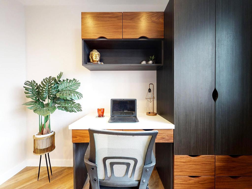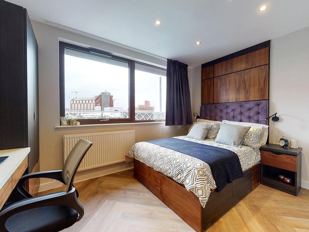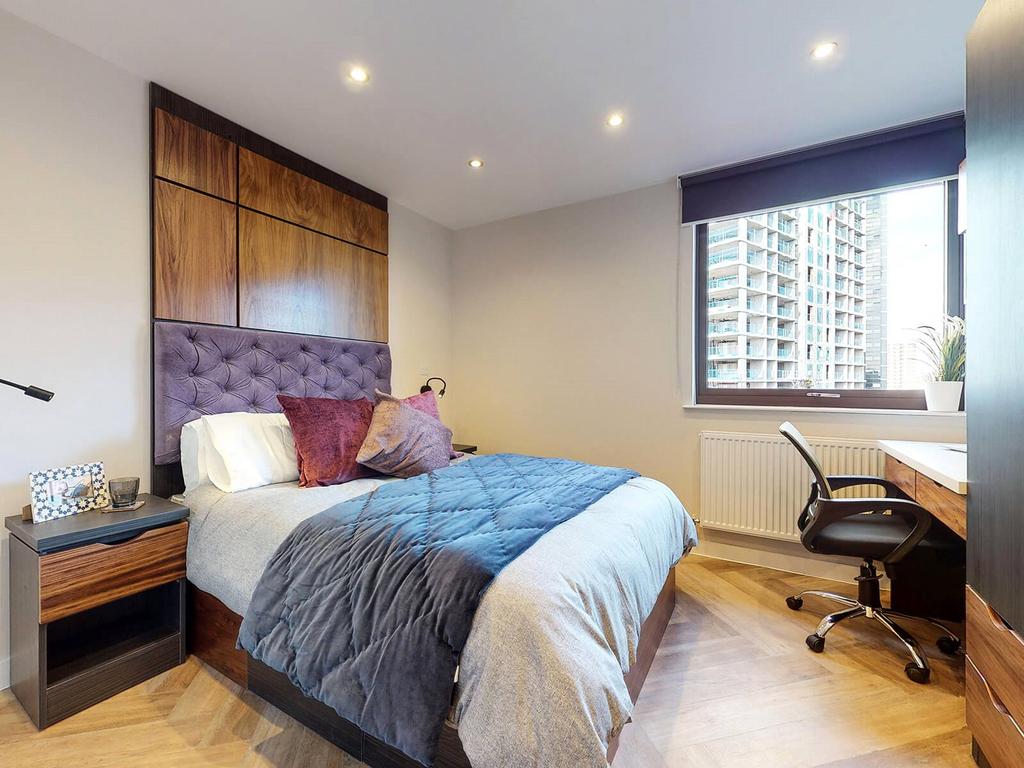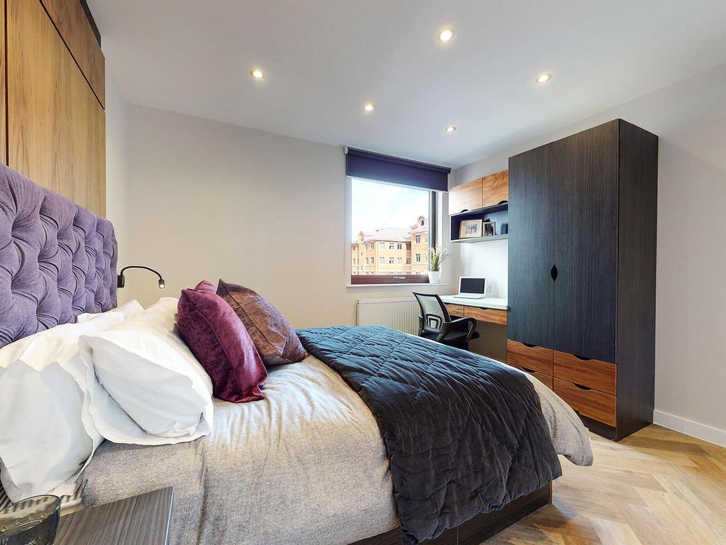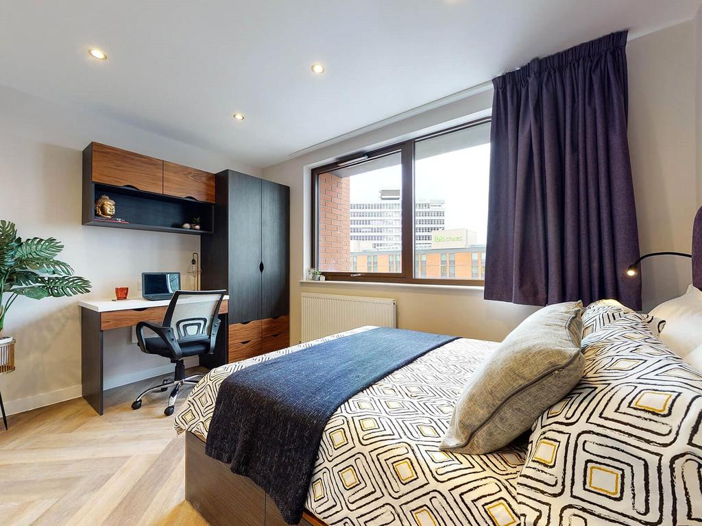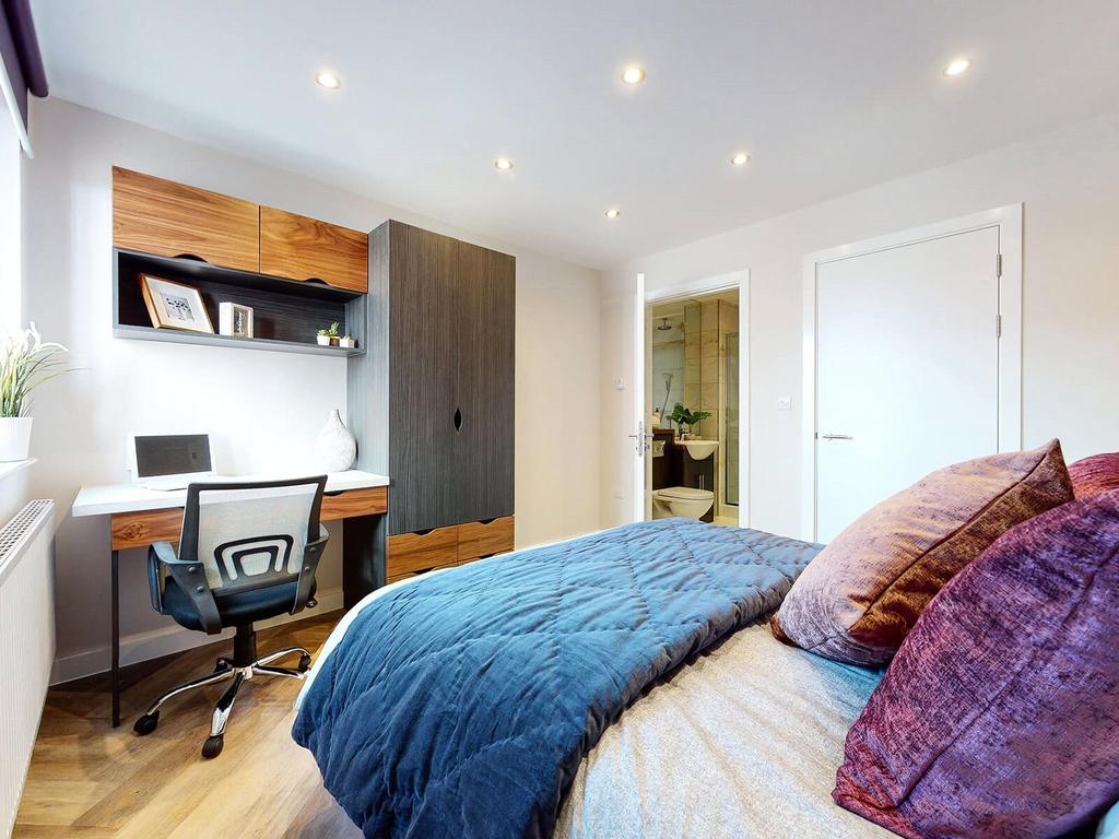 Each bedroom includes a large bed with underbed storage, bedside table, spacious wardrobe and study area with a desk and chair - ideal for working from home or studying in peace.