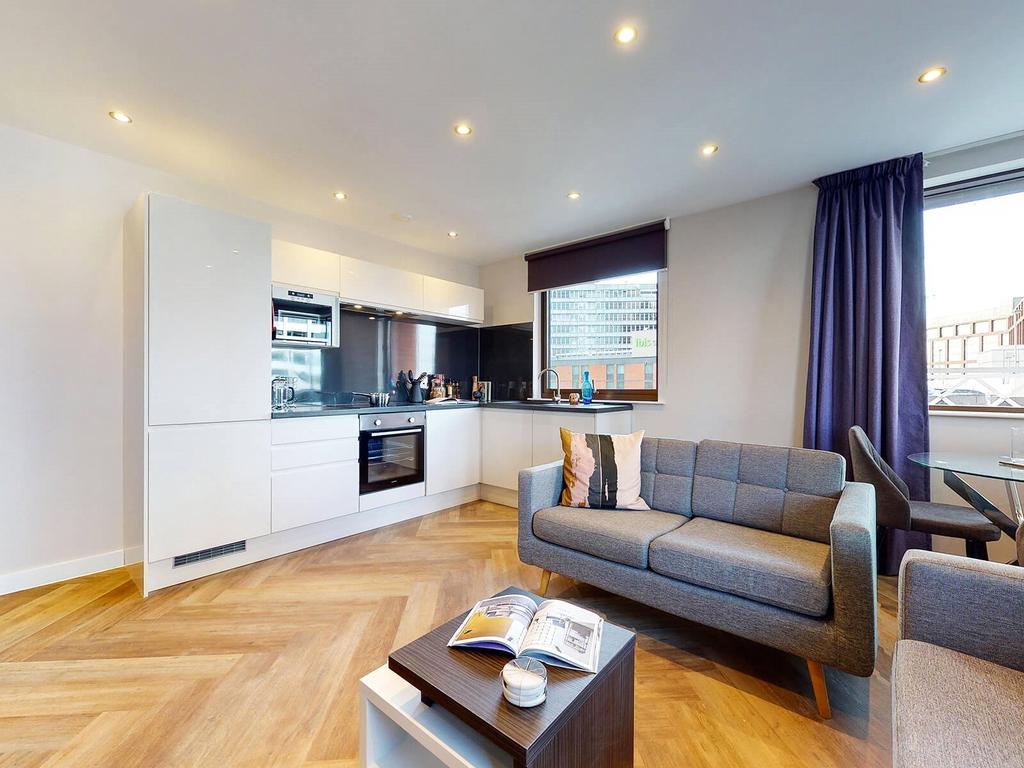 The open plan kitchen is fitted with high-spec appliances including an oven and hob, washer-dryer, integrated fridge with freezer compartment and a microwave. There is a dining table and chairs within the apartment - perfect for dining with friends. The living area offers comfort and convenience, with a two-seater sofa, coffee table, shelving and a 360° rotating smart TV.
