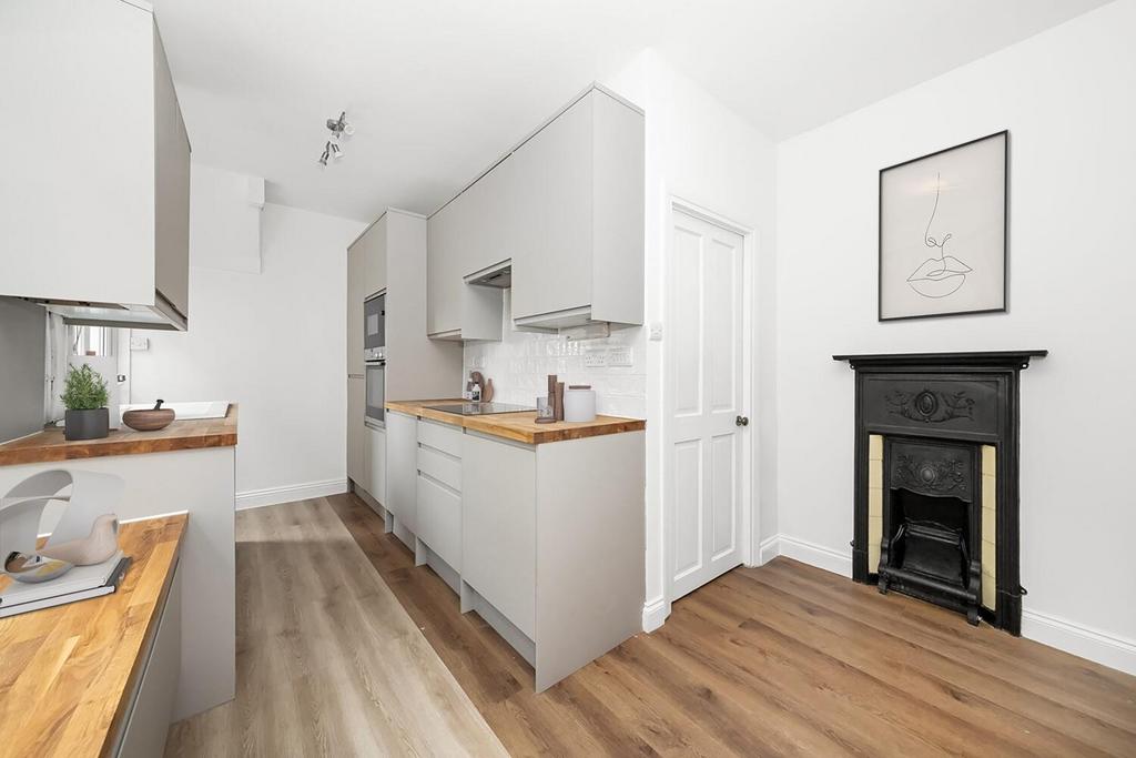 Full of light and charm, the property comprises an impressive 144 x 132 reception with large square bay window, high ceilings, beautiful honey-stained wood flooring and a pretty fireplace, a kitchen/dining room with plenty of space to entertain plenty of guests, a smart kitchen finished in a dove grey with chunky wood block surfaces, a master bedroom with fitted storage and a second bedroom which works well for guests or a work space.