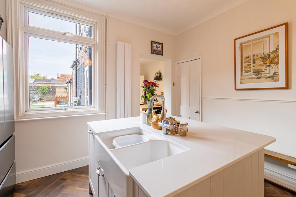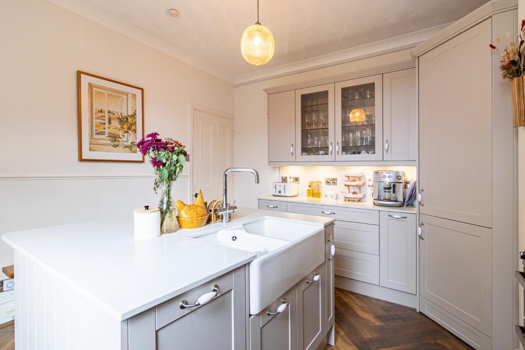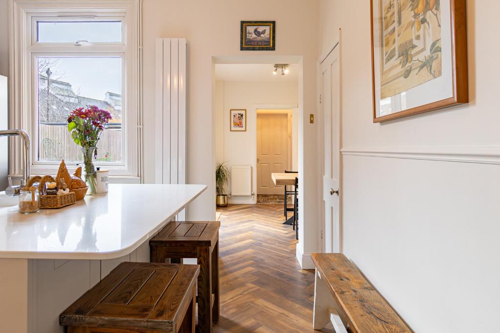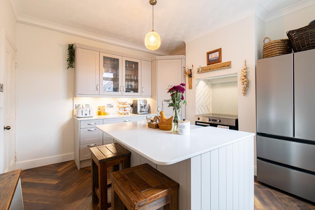Upon entering the property, visitors are greeted by an inviting entrance hall featuring a striking mosaic floor, with doors leading to the ground floor accommodation and stairs rising to the first floor. To the front of the home lies the beautiful living room, flooded with natural light through a large bay window. The room is further enhanced by elegant wall panelling, adding charm and character. Moving through the entrance hall, you’ll discover the stunning newly fitted kitchen, complete with shaker-style storage units, quartz worktops, and a central island with breakfast bar. The kitchen also boasts a 4-in-1 boiling water tap, integrated dishwasher, and a concealed pantry cupboard for extra storage. Adjacent to the kitchen, the dining area features French doors opening onto the garden, creating a seamless connection between indoor and outdoor living. The ground floor is completed by a practical laundry cupboard with plumbing and a family bathroom, which includes a P-shaped bath with shower over, a heated towel rail, and a combination vanity unit with wash basin and WC.