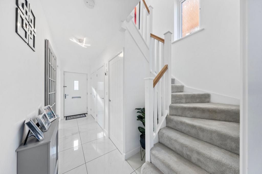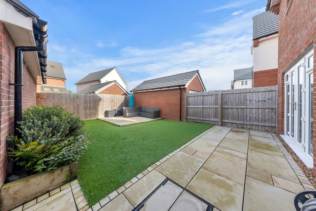 Step outside and be greeted by the meticulously landscaped gardens featuring an artificial lawn bound by patios adorned with border plants, offering the perfect retreat for relaxation or outdoor entertaining.