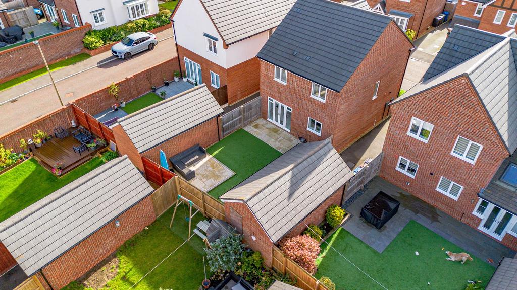 Landscaped gardens with artificial lawn to the rear, patios with border plats, side gate access to the detached garage and driveway