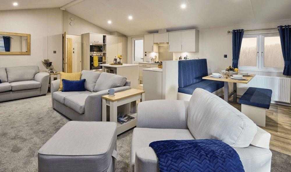 This 2024 model 'Willerby Hayward' is clean and contemporary throughout and has been designed to nail the basics and make everyone feel at home. The Hayward's relaxed interior decor features calming greys punctuated by bold navy blue accents and warm mustard highlights. With deep, comfortable seating in the lounge, dimmable ceiling spotlights and plenty of space for a large screen TV, the Hayward lounge is ideal for both quiet nights in and entertaining guests. Comes as standard with double glazing, freestanding fridge/freezer, kingsize bed, sliding patio doors, integrated microwave, and an ensuite shower room. Also includes a deluxe pack and the exterior is in grey Timberwolf Canexel cladding.
