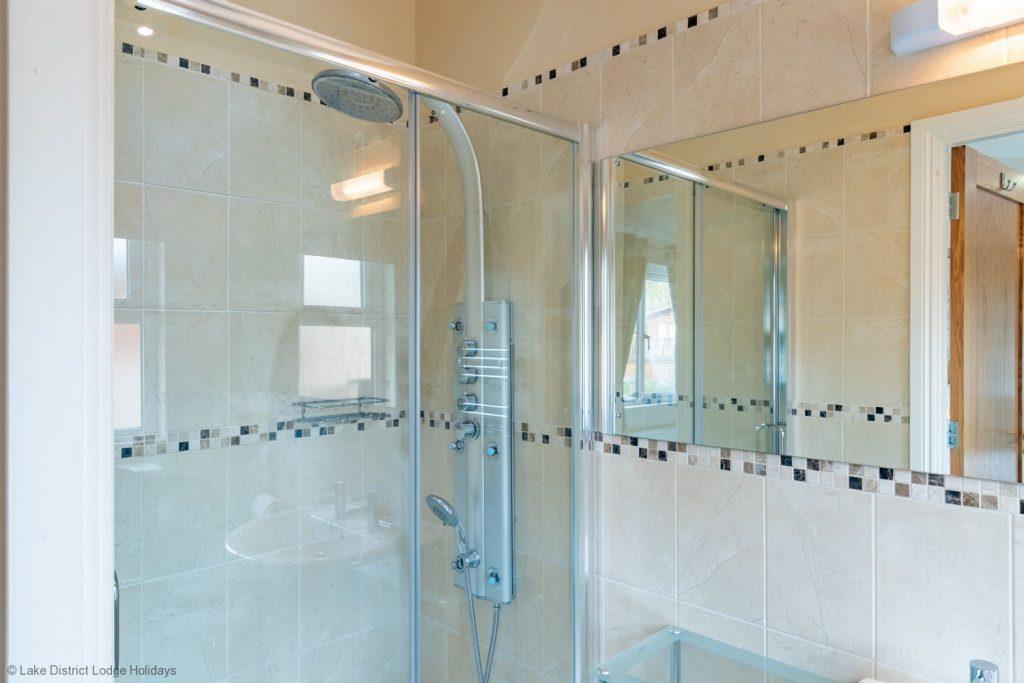 En suite with double width walk in shower, hydro massage shower, toilet, hand basin and heated towel rail