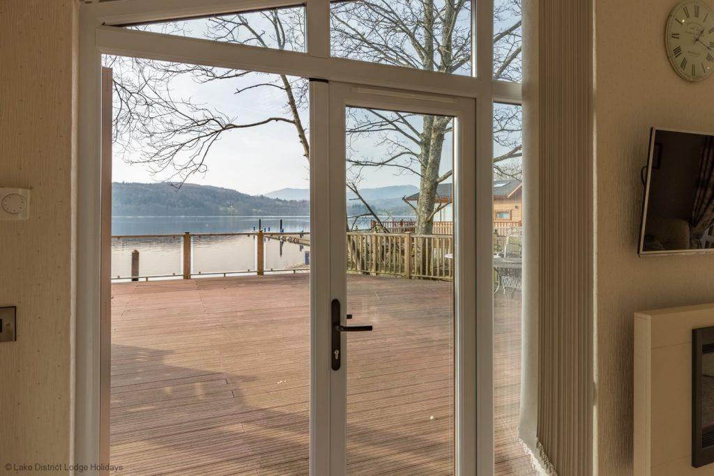 Picture windows looking out across the lake. One set of patio doors opening out onto the vast deck area