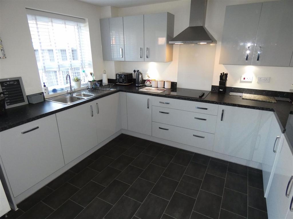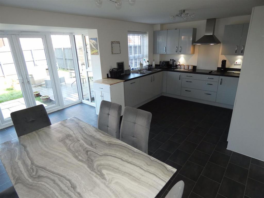 Dining Kitchen - 11' 5'' x 19' 3'' (3.48m x 5.86m) - Modern open plan kitchen / diner connected perfectly to the rear garden via protruding UPVC double glazed French doors with full length glass panels and additional UPVC window to the rear, allowing plenty of natural light. Wide range of grey gloss wall and base units with LED downlighting and contrasting laminate work surfaces and upturn splashbacks.1.5 bowl sink and drainer with mixer tap, inset electric hob with glass splashback panel and illuminated chimney cooker hood. Built in eye level electric oven, integrated tall fridge freezer and automatic dish washer. Tile effect laminate flooring, 2 x ceiling lights and radiators. Door leading to utility room and WC.