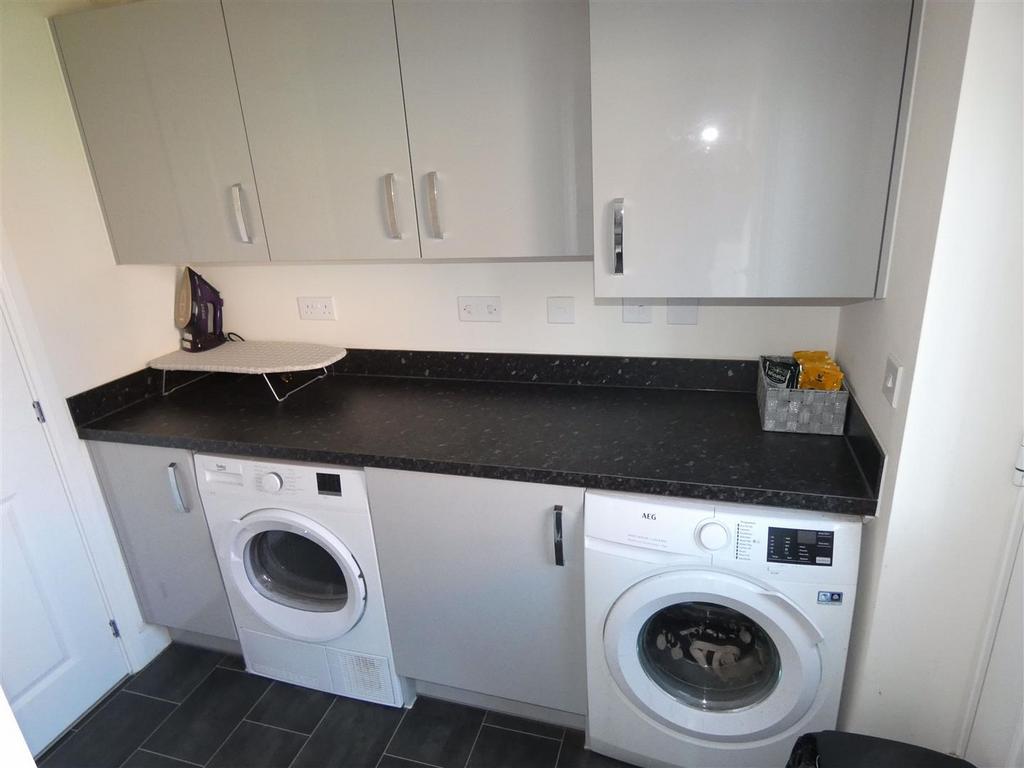 Utility Room - Composite double glazed exterior door to the rear. Fitted wall and base units including housing for central heating boiler and incorporating laminate work surface with upturn splashbacks. Under counter spaces and plumbing for washing machine and tumble dryer, ceiling light, tile effect laminate floor and radiator.