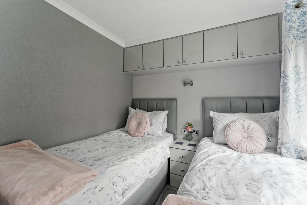 Second Bedroom - • Upholstered Divan beds in gunmetal grey, with matching headboards and pocket sensation mattress • Bedside drawers and wall light • Mirrored double wardrobe • Wall cabinet storage • Door leading direct to family bathroom