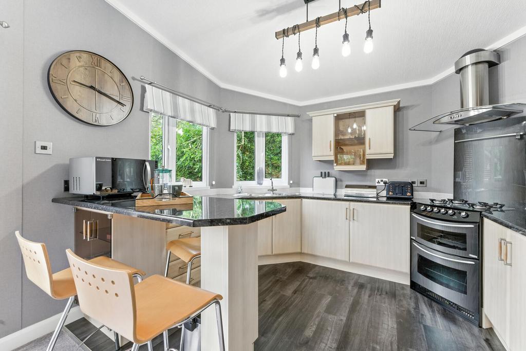Luxury three-bedroom lodge with a contemporary open living space situated in a quiet location on Limefitt Park. This lodge is spacious and bright and has generous sized rooms throughout, including master bedroom with a bespoke en-suite and an additional family bathroom with sophisticated and stunning Fibo Aqualock panelling and Roca vanity units to both. The open plan Kitchen/ Living /dinning area with patio doors open out onto a large south facing decking area which is perfect for enjoying the Lakeland stunning views. The property also benefits from having Karndean Design flooring in the bathrooms, kitchen and hallway. This Lodge has only had one private owner and has not been previously rented out, it has an excellent potential income for discerning guests looking for a high end, spacious 3-bedroom rental property – Parkdean provide a fully serviced letting package for a hassle-free income.