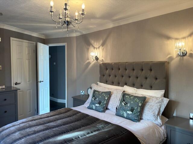 Master Bedroom - • Double size bed with Upholstered headboard • Triple sized wardrobe • Modern bedside tables and chest of three drawers • Laura Ashley bedside lights