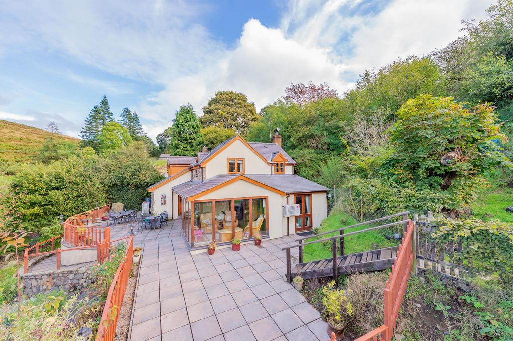 A large wrap-around patio area greets you, providing ample space for outdoor entertaining and enjoying the scenic views. Steps lead down to a formal lawned garden with established flower borders and a cozy seating area. An archway with a gate offers access to the stable block, which features two loose boxes, a tack room, and a spacious workshop.