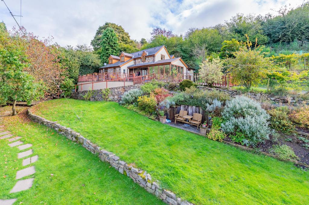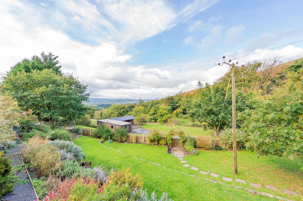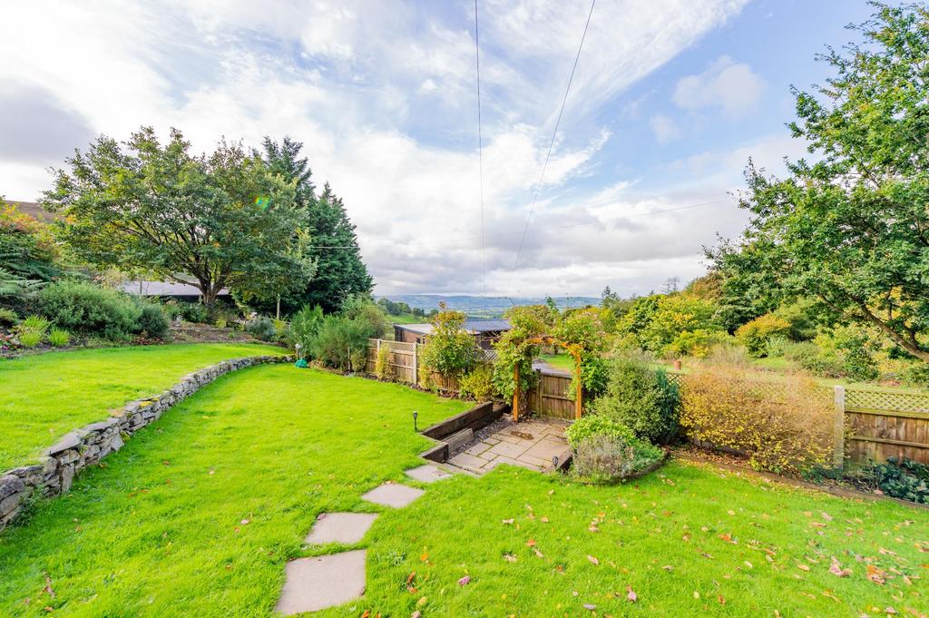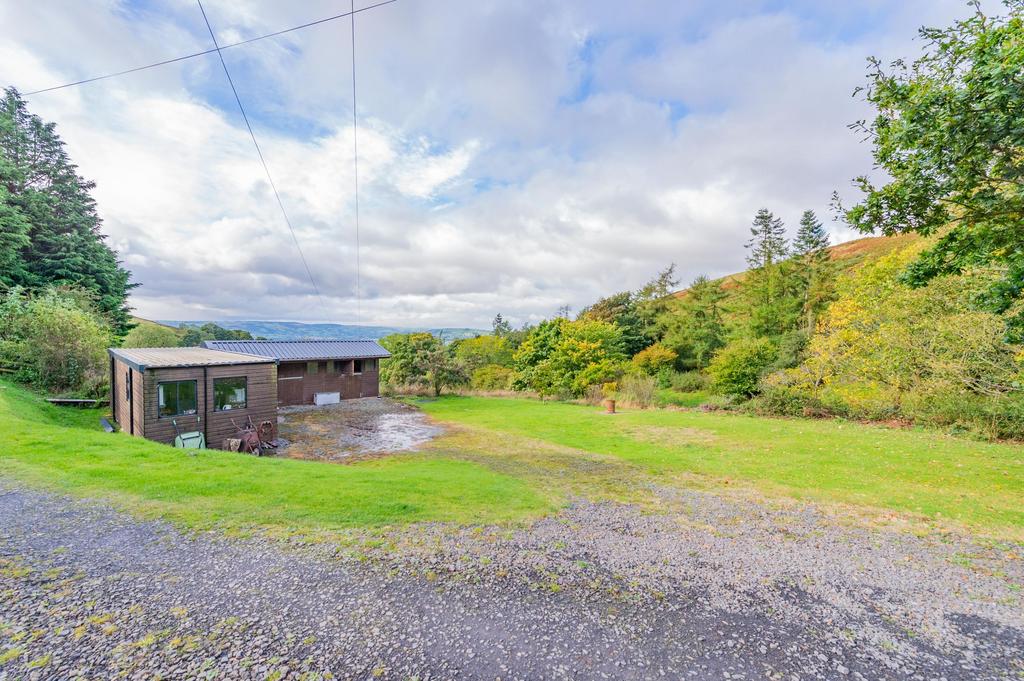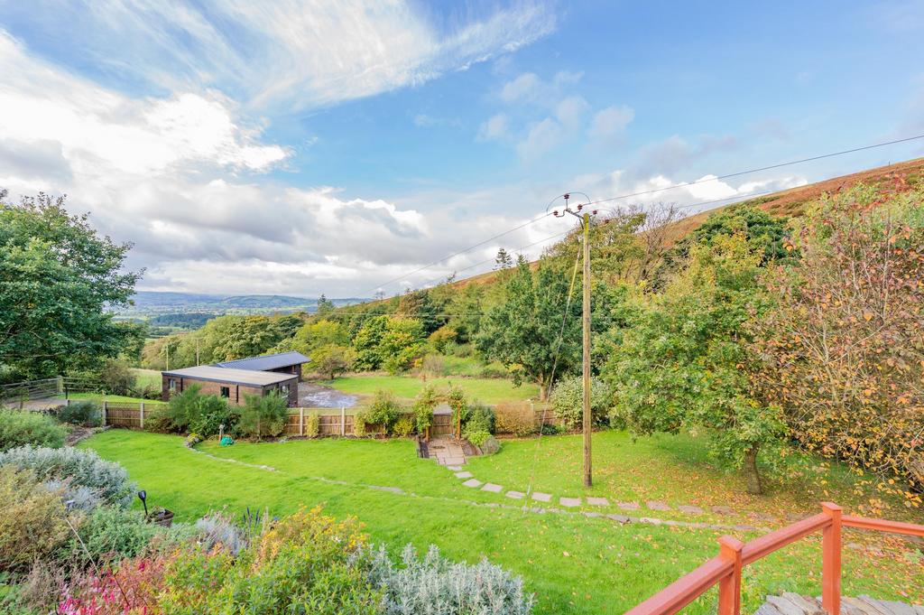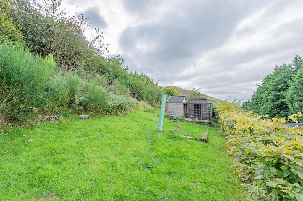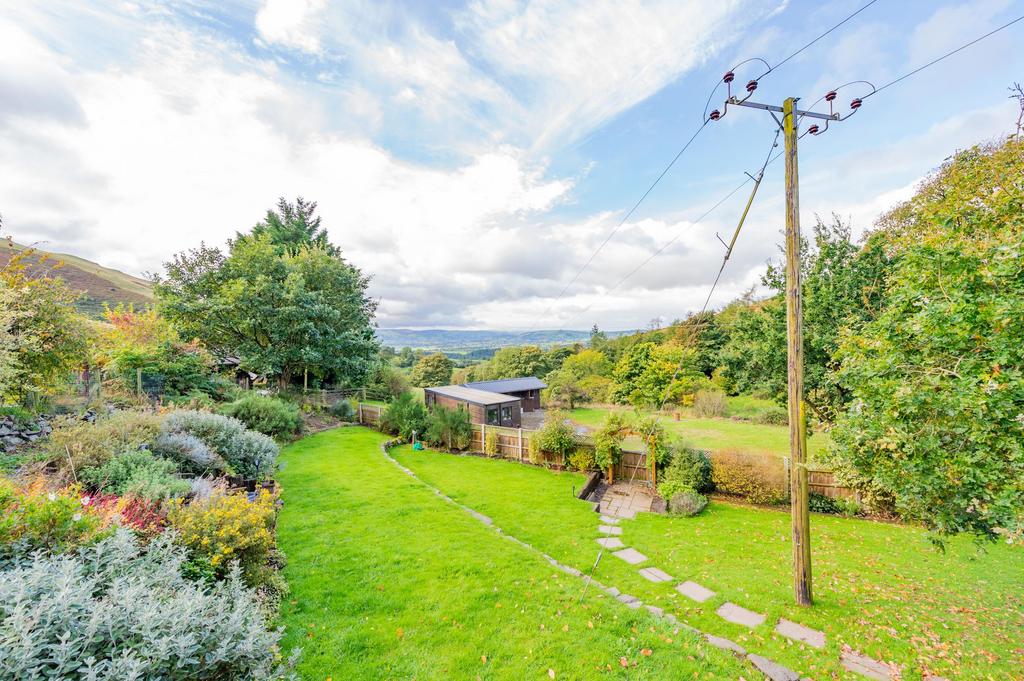 To the front of the property, additional steps lead up to a chicken area and a section of land with 12 solar panels, providing electricity to the house and generating income through a feed-in tariff. The path continues through wild terrain with stunning views of Corndon Hill, Stapeley Hill, and the rolling countryside. At the top, you'll find two open paddocks, ideal for grazing livestock or horses. The top field also includes a right of way to the main road.