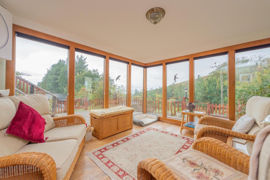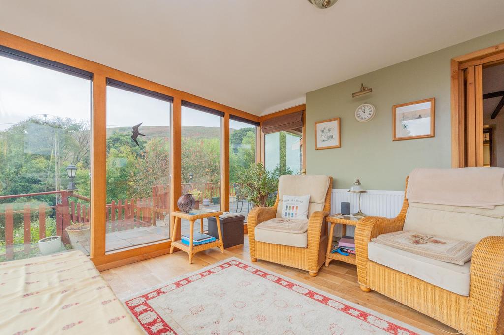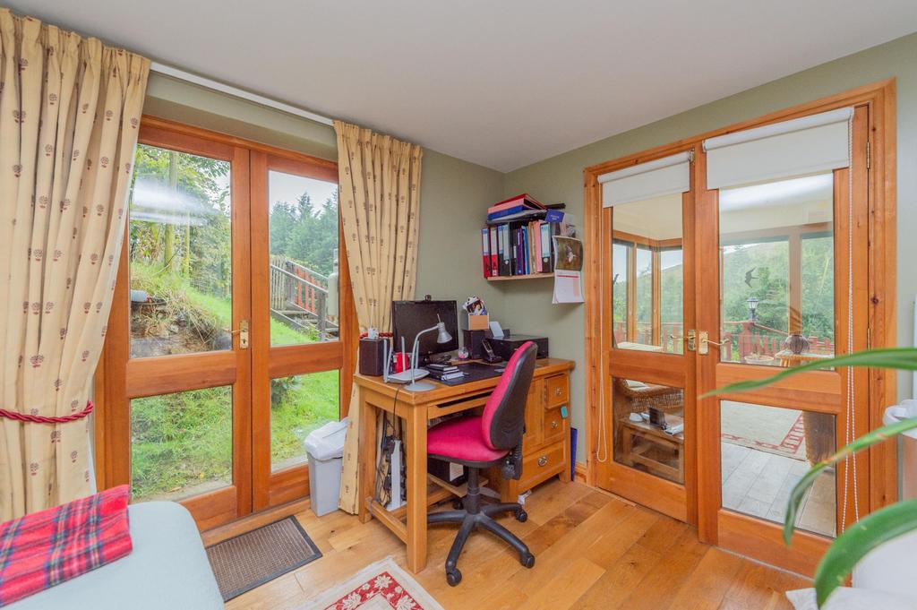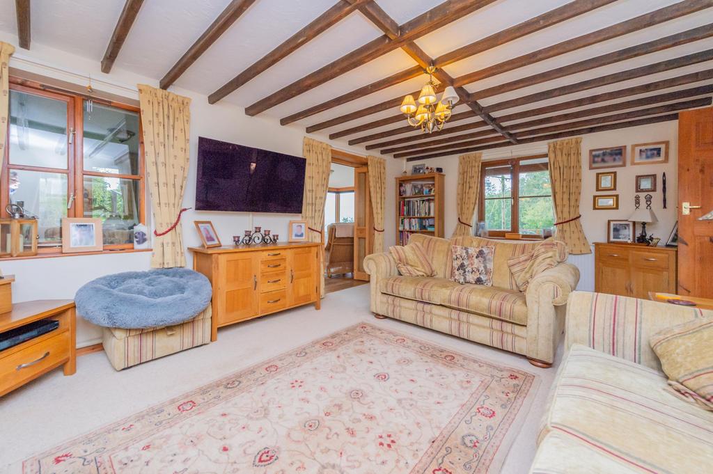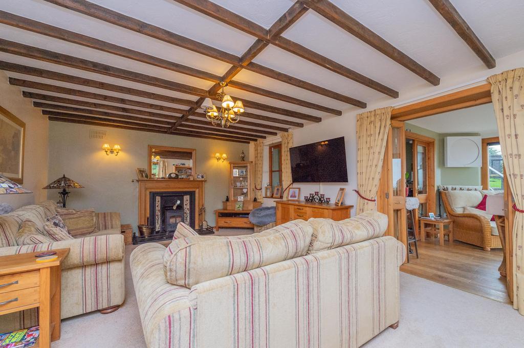 The lounge is a relaxing space with a carpeted floor and exposed ceiling beams, creating a warm and inviting atmosphere. A multi-fuel stove with a decorative tile back and oak surround provides both heat and ambiance. From the lounge, you can access the orangery, a wonderful light-filled space that's perfect for year-round relaxation. The orangery features an air conditioning unit and a door leading outside. Additionally, there's a study/bedroom 4 with double doors leading outside, providing a versatile space for various needs.
