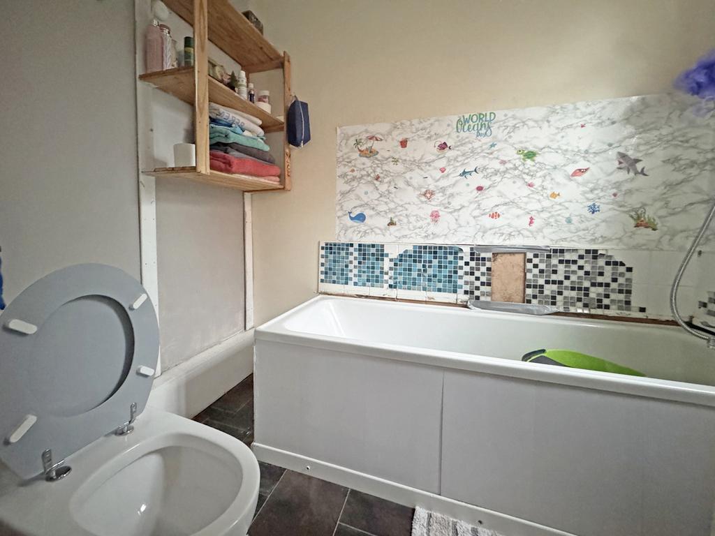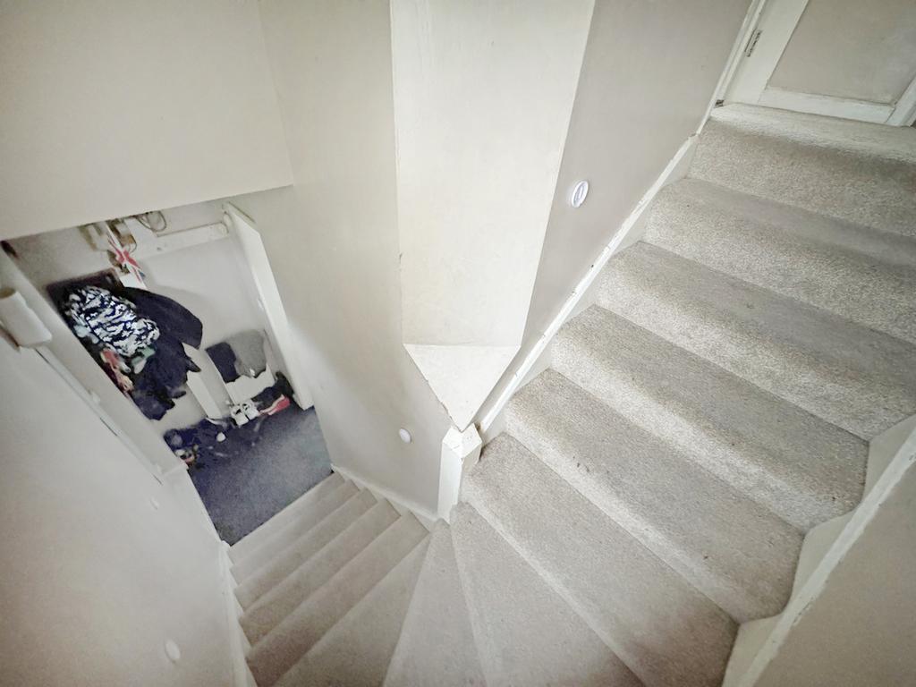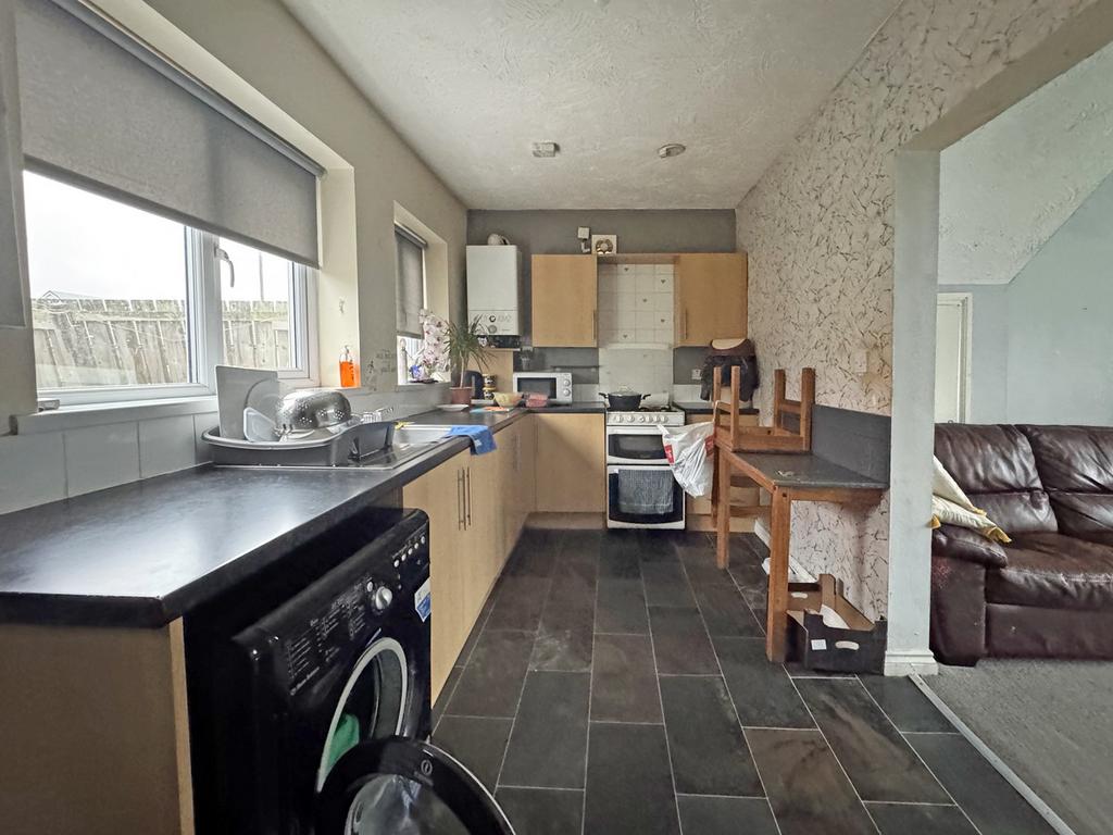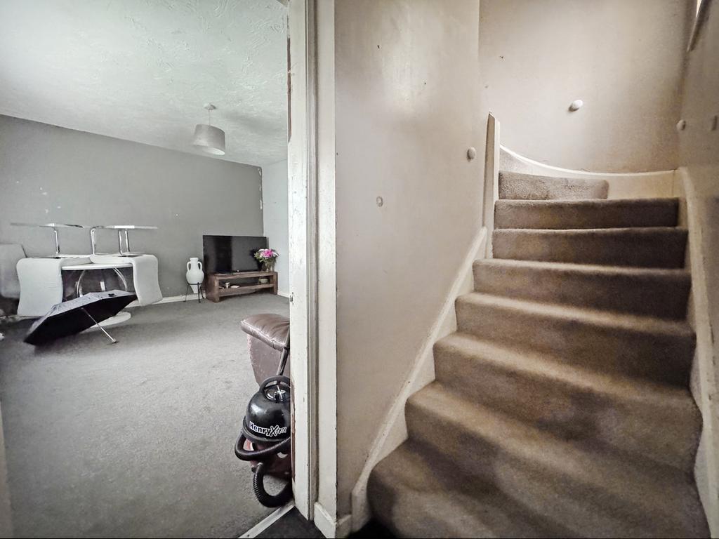 As you enter the property, you’re welcomed into a brief reception area, with staircase running up to the right and a door leading directly into the living room ahead. The ground floor consists of a full aspect, open plan living room and kitchen, with a soft grey carpet in the living room, switching to vinyl flooring in the kitchen. There’s a large window to the front aspect and two further windows to the rear, with rear door into the private garden. The kitchen is fitted with an array of light wood veneer units with contrasting black worktops. Off the kitchen to the left, you’ll find the family bathroom, with a white suite with chrome wall mounted shower over the bath.