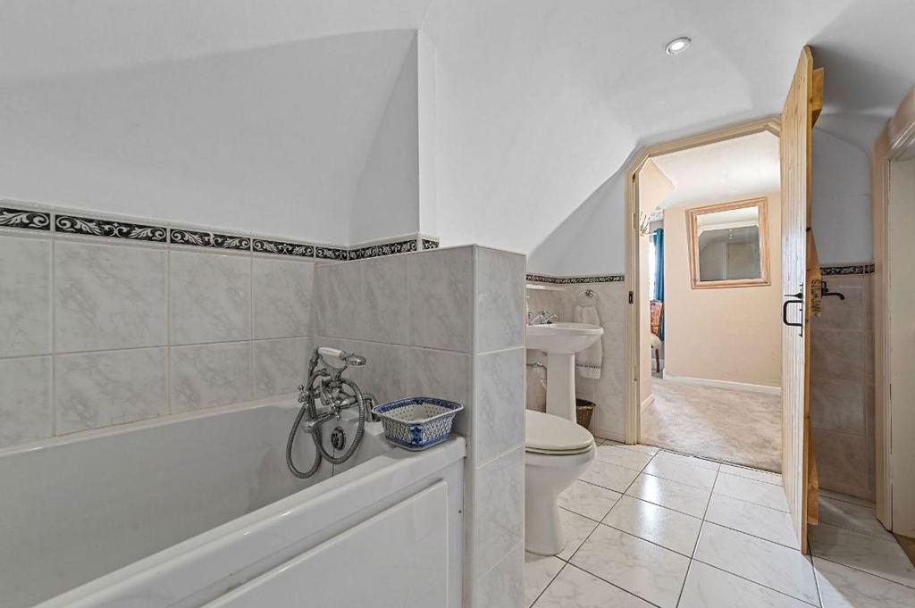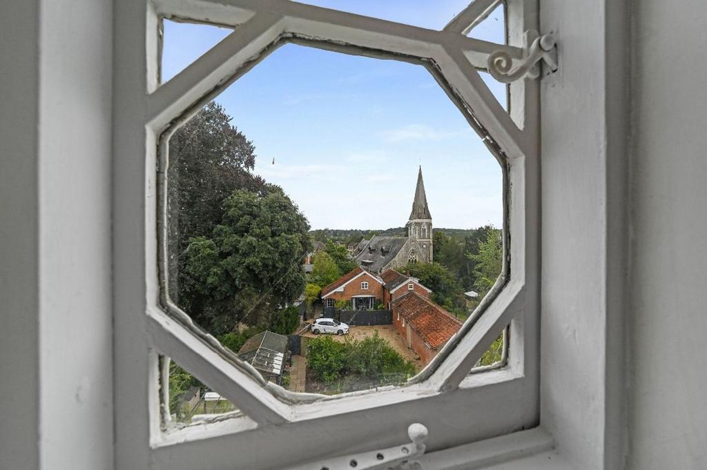 Upstairs, the first floor offers three generously proportioned bedrooms, two of which feature original fireplaces, while two others are adorned with exposed beams. The luxurious family bathroom is equipped with a walk-in shower, roll-top bath, and high-quality fittings. A further staircase leads to the second-floor bedroom, complete with its own en suite bathroom and access to the lookout—a peaceful retreat offering spectacular far-reaching views, ideal for an observatory.