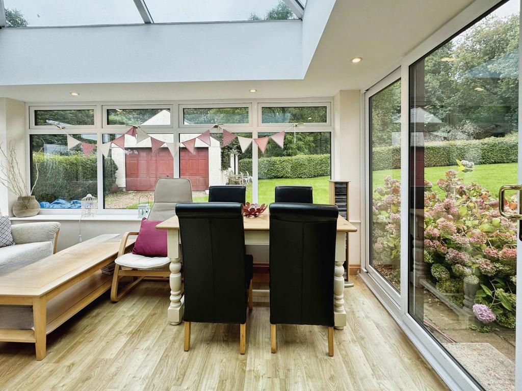 This airy, light-filled space features a sky lantern and triple-aspect windows, creating a wonderful connection to the surrounding gardens. Karndean flooring and patio doors provide a modern touch, making it the perfect spot for relaxing or entertaining.