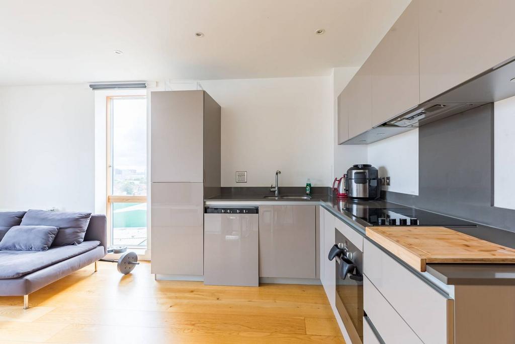 Contemporary and bright 1-bedroom flat featuring ample storage, a stylish bathroom, a spacious bedroom, and a sophisticated open-plan reception room and kitchen with fitted appliances, leading to a private balcony.
