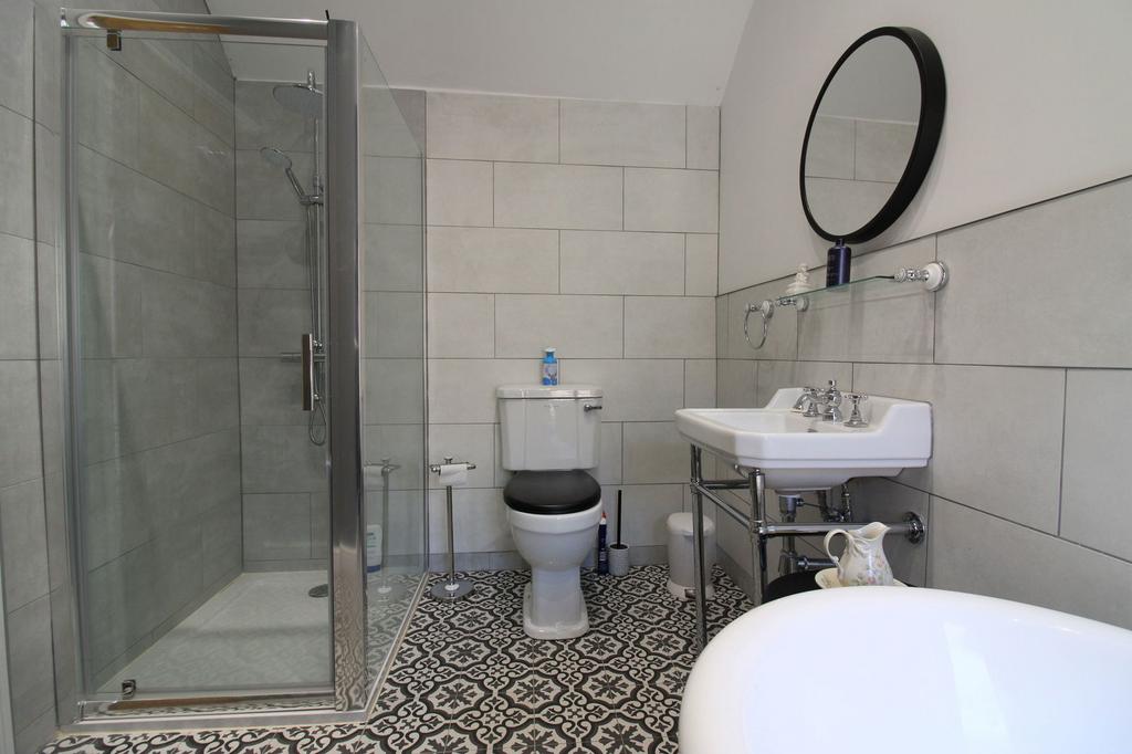 En suite Shower Room. 11'2'' x 7'2'' With beautiful Victorian style suite with a free standing ball and claw rolled top bath with mixer tap, low level wc and wash hand basin with chrome finish legs by Bayswater. Separate shower cubicle. Tiled to the suite area, Victorian style decorative tiled flooring. recessed spot lights, loft hatch to the internal roof space.