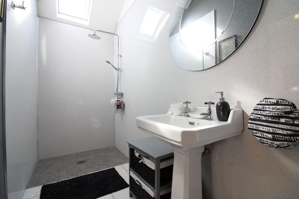 En suite shower room - With walk in shower/wet room area with tiled flooring and double glazed velux style window. Low level wc and pedestal wash hand basin. Aqua panelled walls.