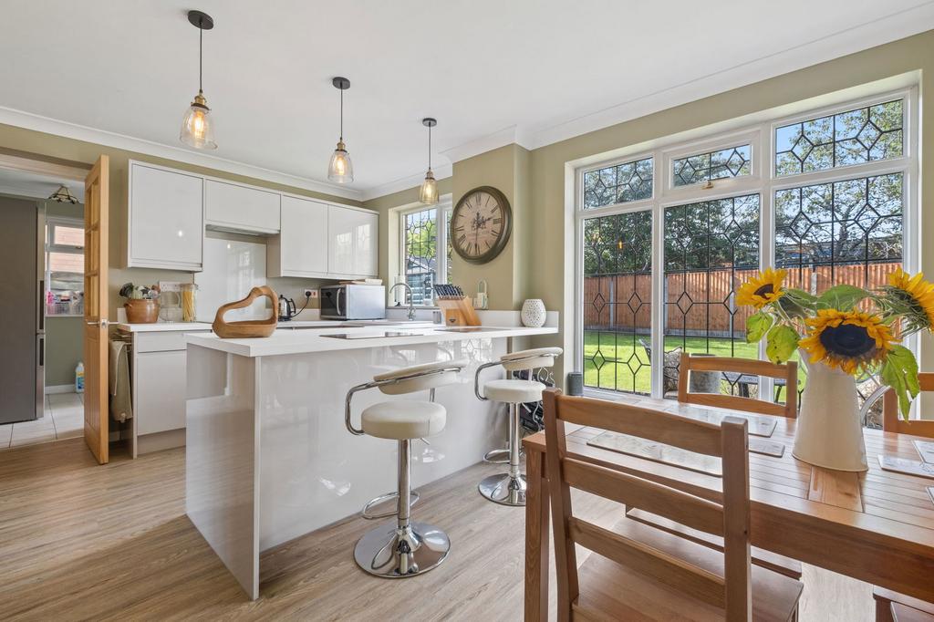 Good range of fitted units comprising sink unit with mixer tap, fitted base cupboards and drawers, matching fitted wall cupboards, island unit with breakfast bar, range of Whirlpool appliances including electric hob with extractor unit over and oven under and dishwasher, radiator, ample room for dining table and chairs, two leaded light style double glazed windows overlooking the rear garden and doors to Pantry and Utility Room.