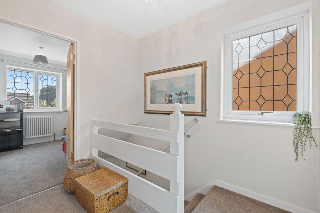 Hatch to loft area with loft ladder, cupboard off, housing the central heating boiler and doors to the 3 bedrooms and the bathroom.