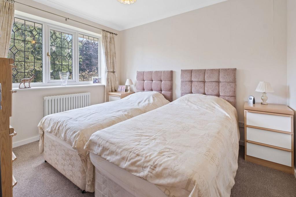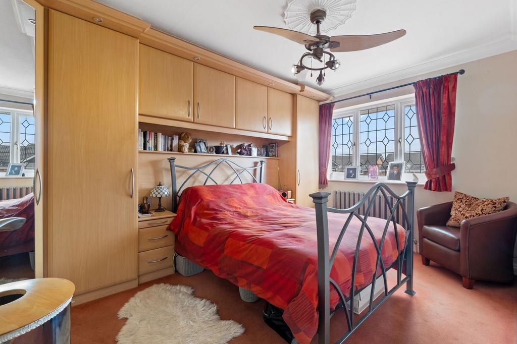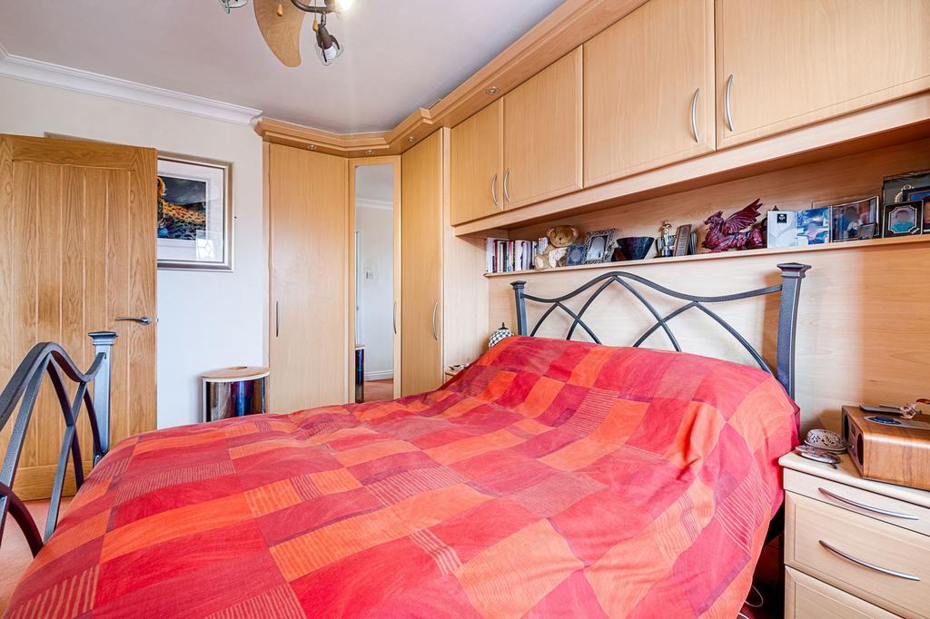 Excellent range of fitted wardrobes, central headboard with side drawer units, radiator and leaded light double glazed window facing front.
