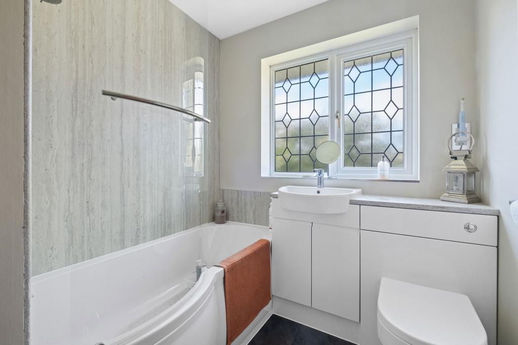 White suite comprising panelled bath with shower over, vanity unit inset with wash basin and WC, heated towel rail and double glazed leaded light style window facing rear.