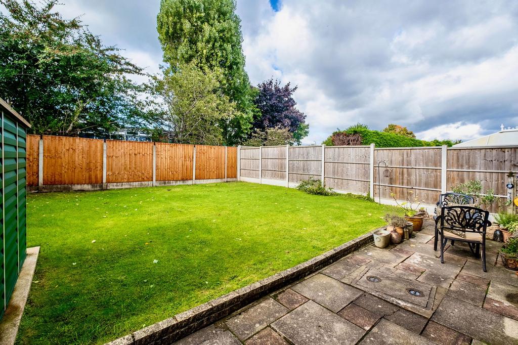 Paved patio, good sized lawn, garden shed and boundary fencing.