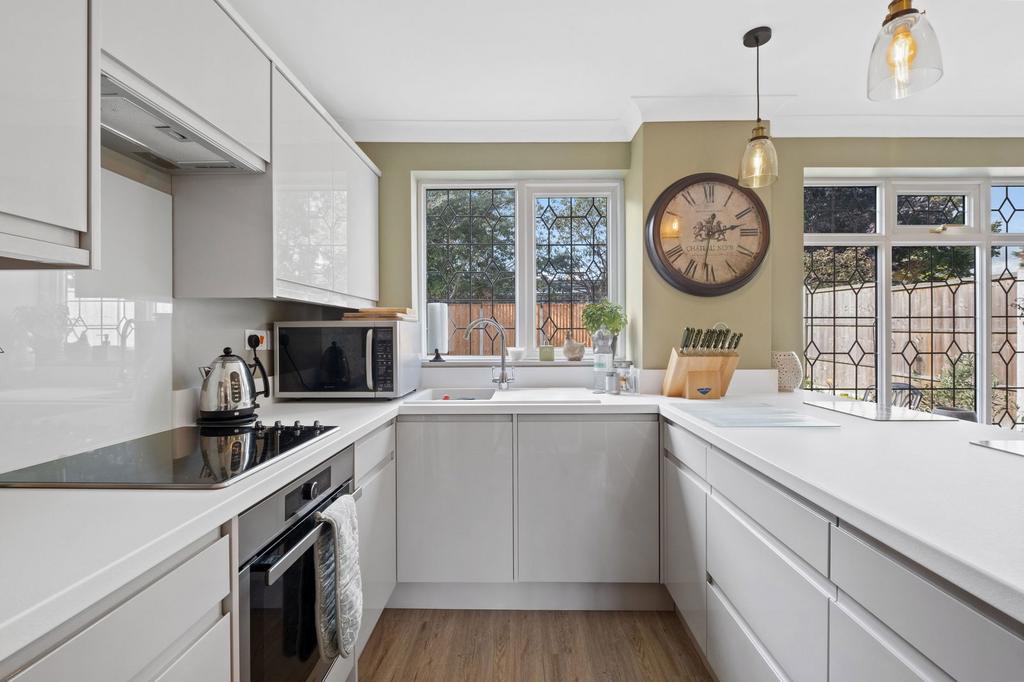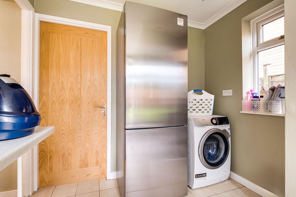 Plumbing for washing machine, wall cupboards, fitted work surface, tiled floor, radiator, doors to garage, guest cloakroom and rear garden.
