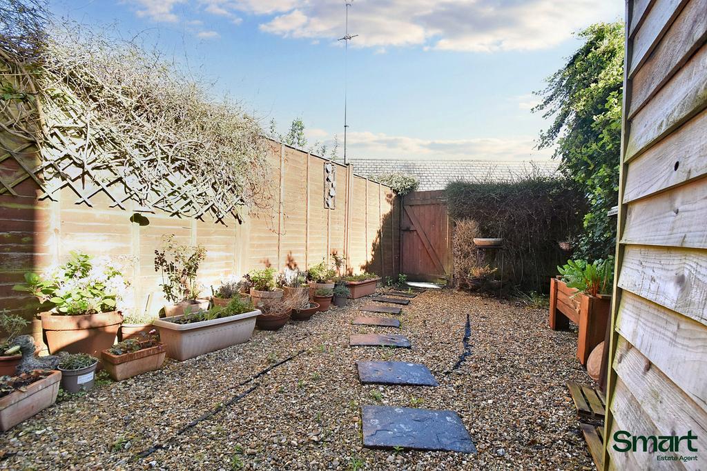 To the rear of the property is a level enclosed and easy to maintain garden with a patio for seating and a graveled area with flower and shrub borders. A rear gate gives pedestrian access to a