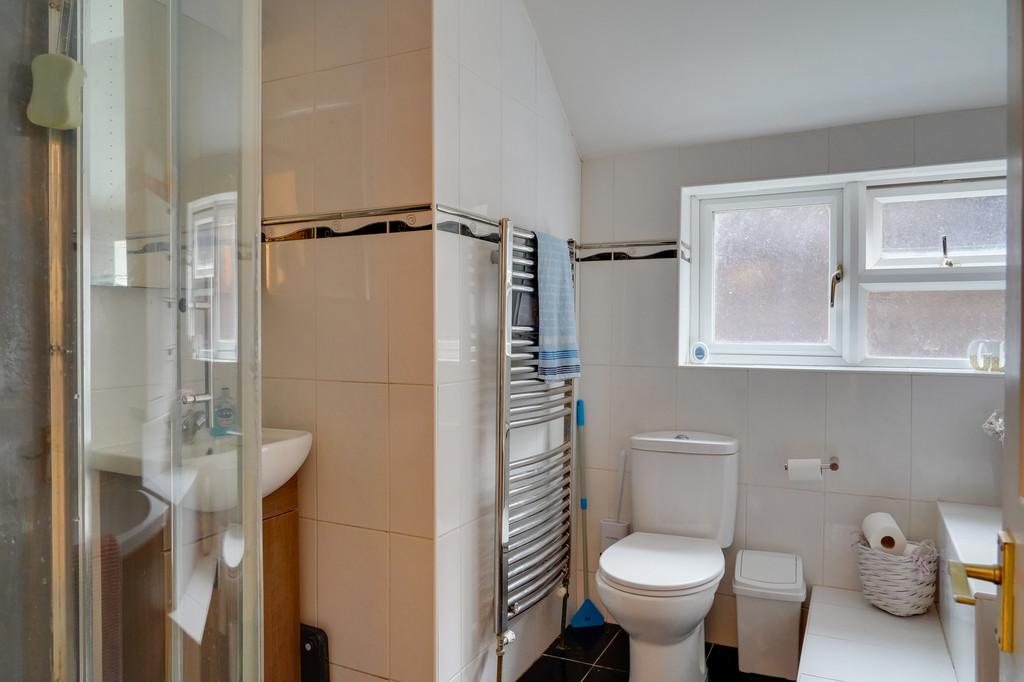 BATHROOM Fitted with a white suite comprising a WC, wash basin, bath, shower cubicle, heated towel rail and extensively tiled walls and floor.