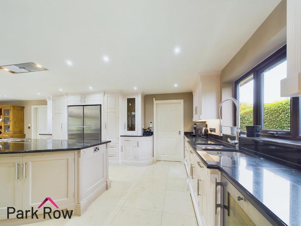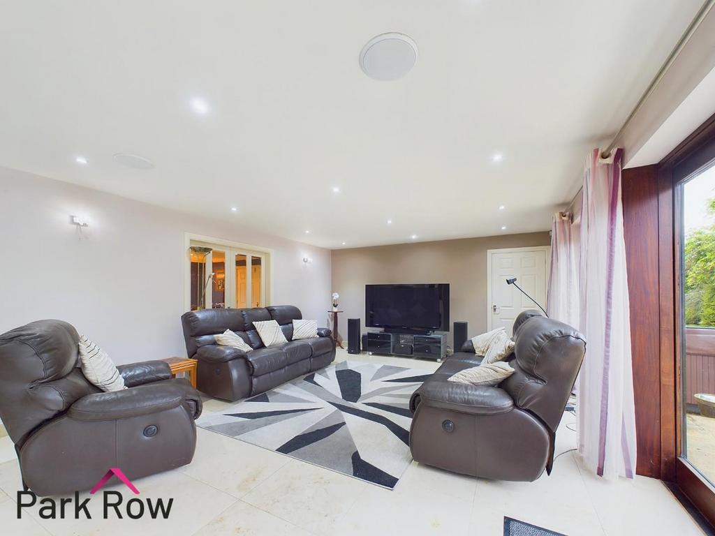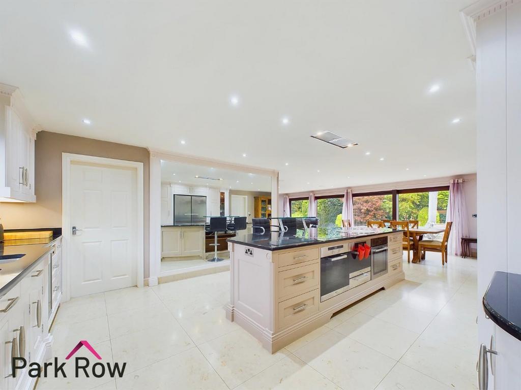 The kitchen area is 4.64 x 4.49m and includes; double glazed window to the side elevation, various white wall and base units with LED lighting surrounding, space for a freestanding double fridge/freezer, black granite worktop, double sink set within the worktop, integral wine fridge, underfloor heating, island to the centre which matches the kitchen, built in ovens within the island, hob to the centre of the island with an extractor fan to the ceiling. The dining/lounge area is 10.15 x 4.49m and includes; wooden double glazed doors which lead out to the rear garden, various areas for seating and internal doors which lead into;