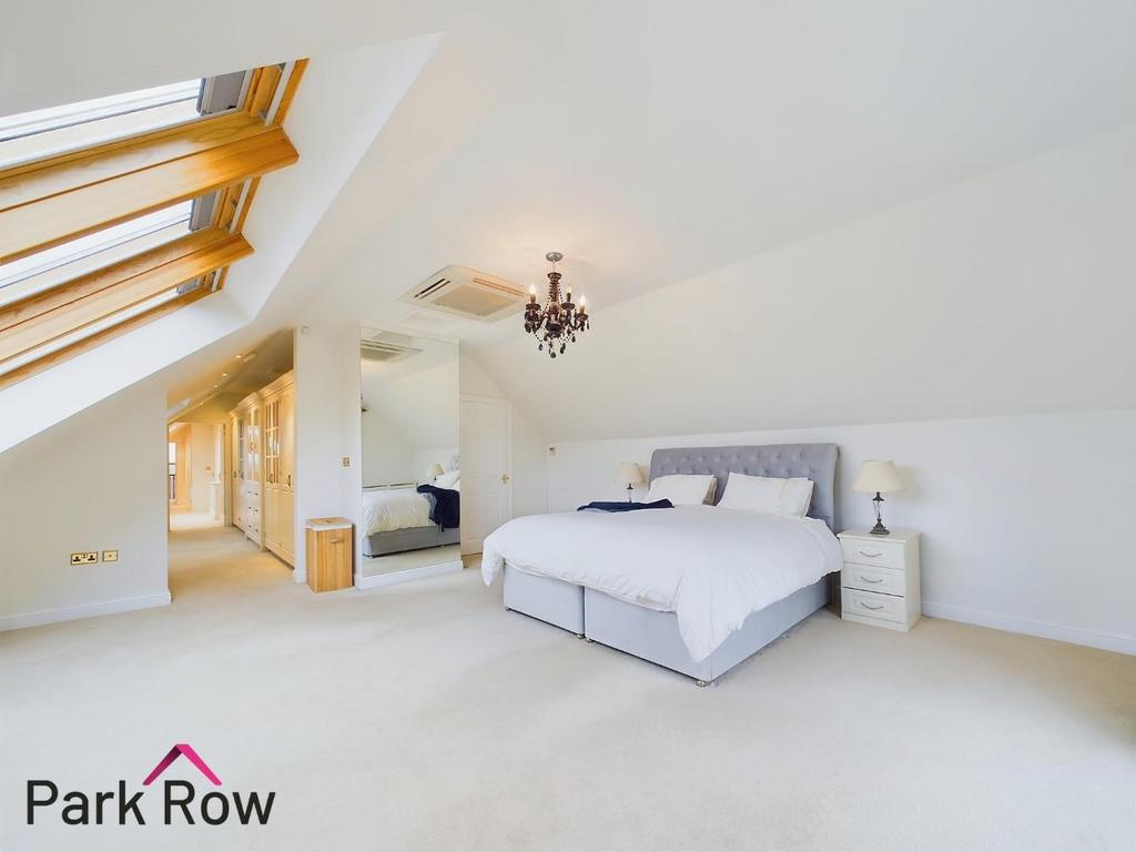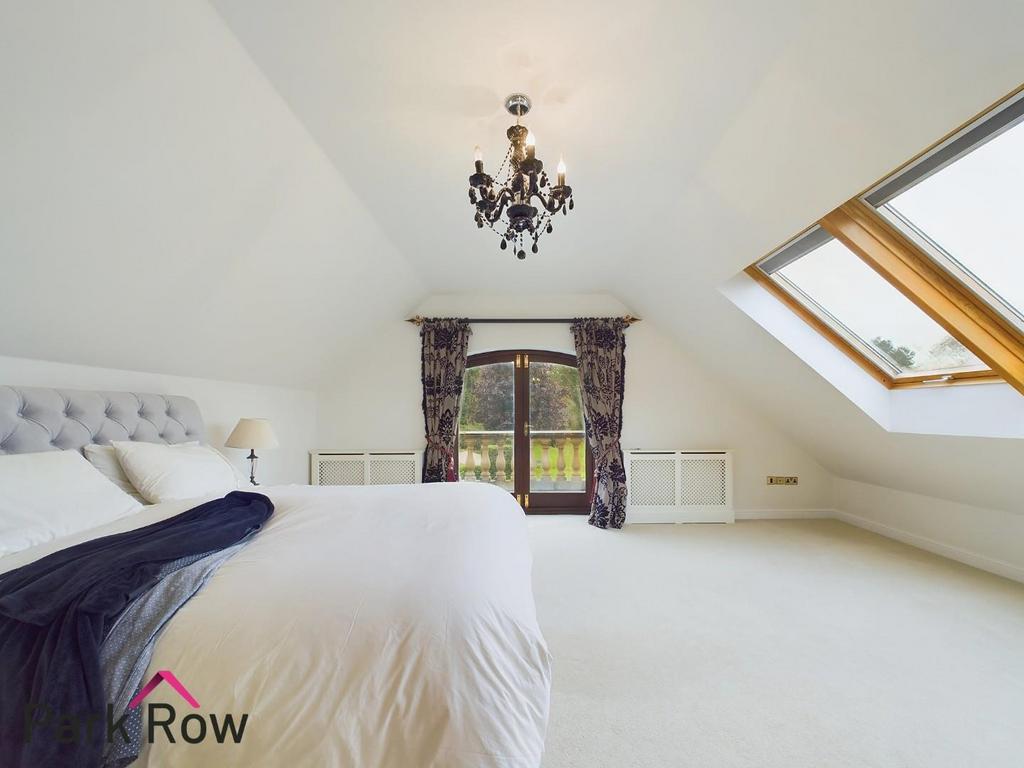 Master Bedroom - 5.95 x 5.87 (19'6" x 19'3") - Three double glazed Velux windows to the side elevation, two central heating radiators with white wooden radiator covers, aircon installed, an internal door which leads into the en-suite plus double glazed curved double door which leads out to: