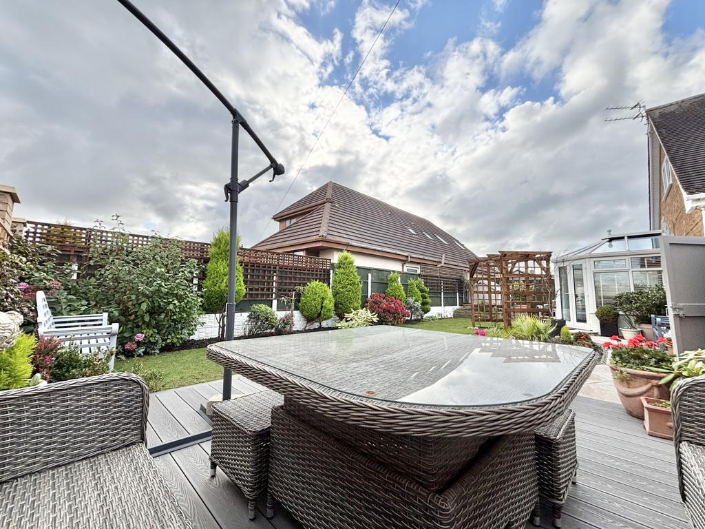 SOUTH FACING- Mainly laid to lawn, composite decking area. Mature range of shrubs/plants.